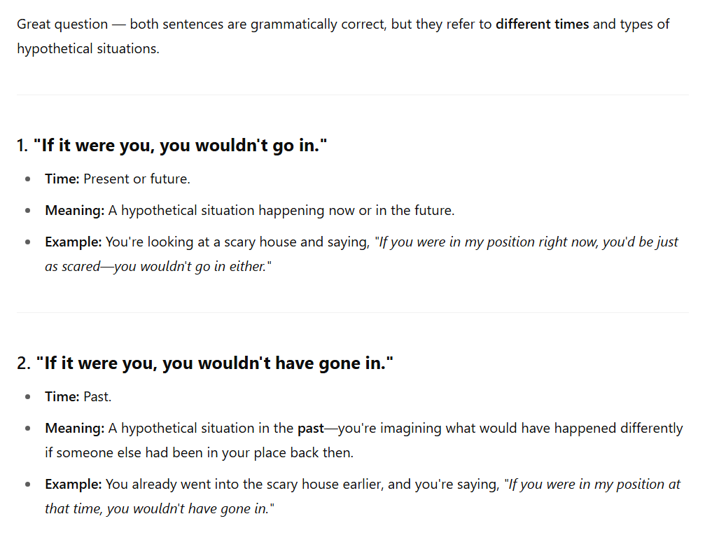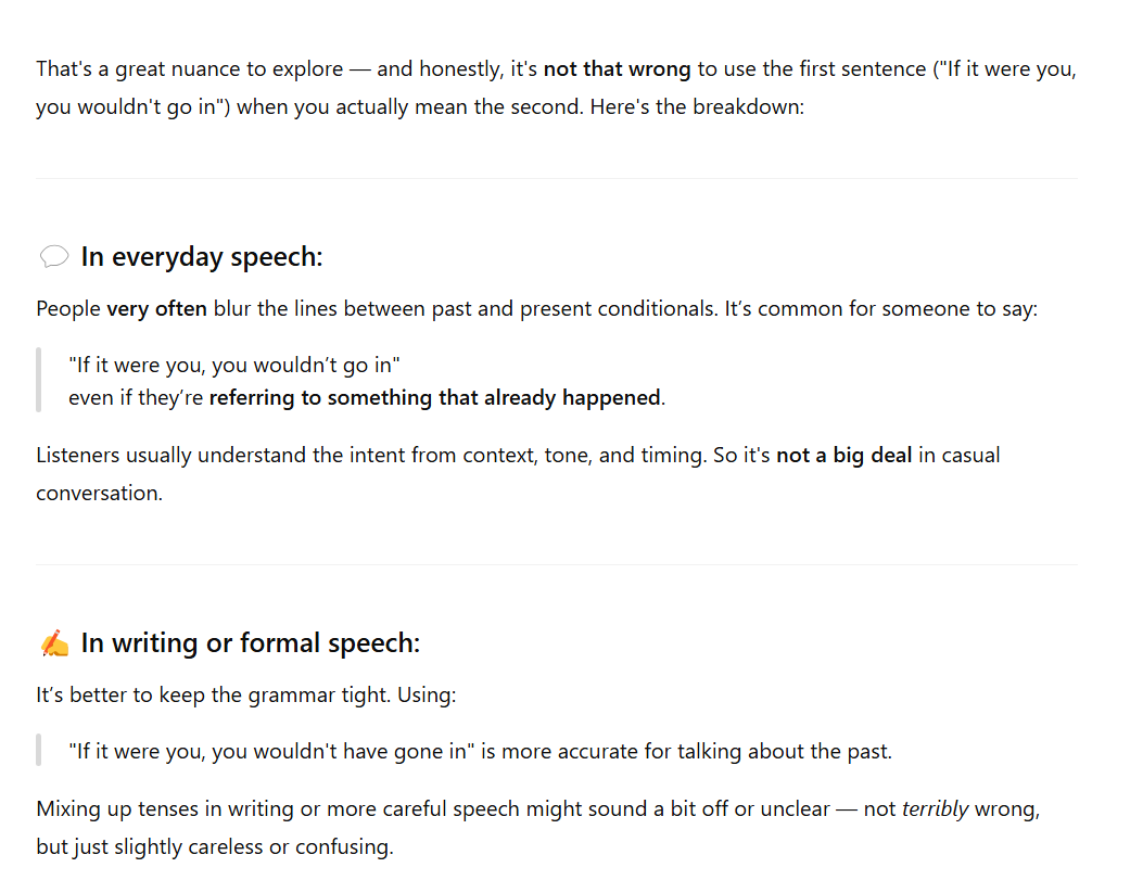 >>729377 >там абсолютно те же правила. не неси хуйни. это тот же самый язык. Часто бывает, что носители чаще будут использовать past simple в ситуациях, когда учебник требует present perfect. Перфект форма может звучать даже излишне вычурно иногда. Не то, чтобы это неправильно, очень даже правильно, но вычурно. В этой ситуации гоняться за учебником странно.