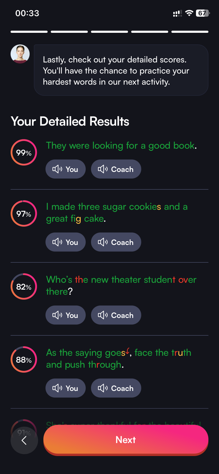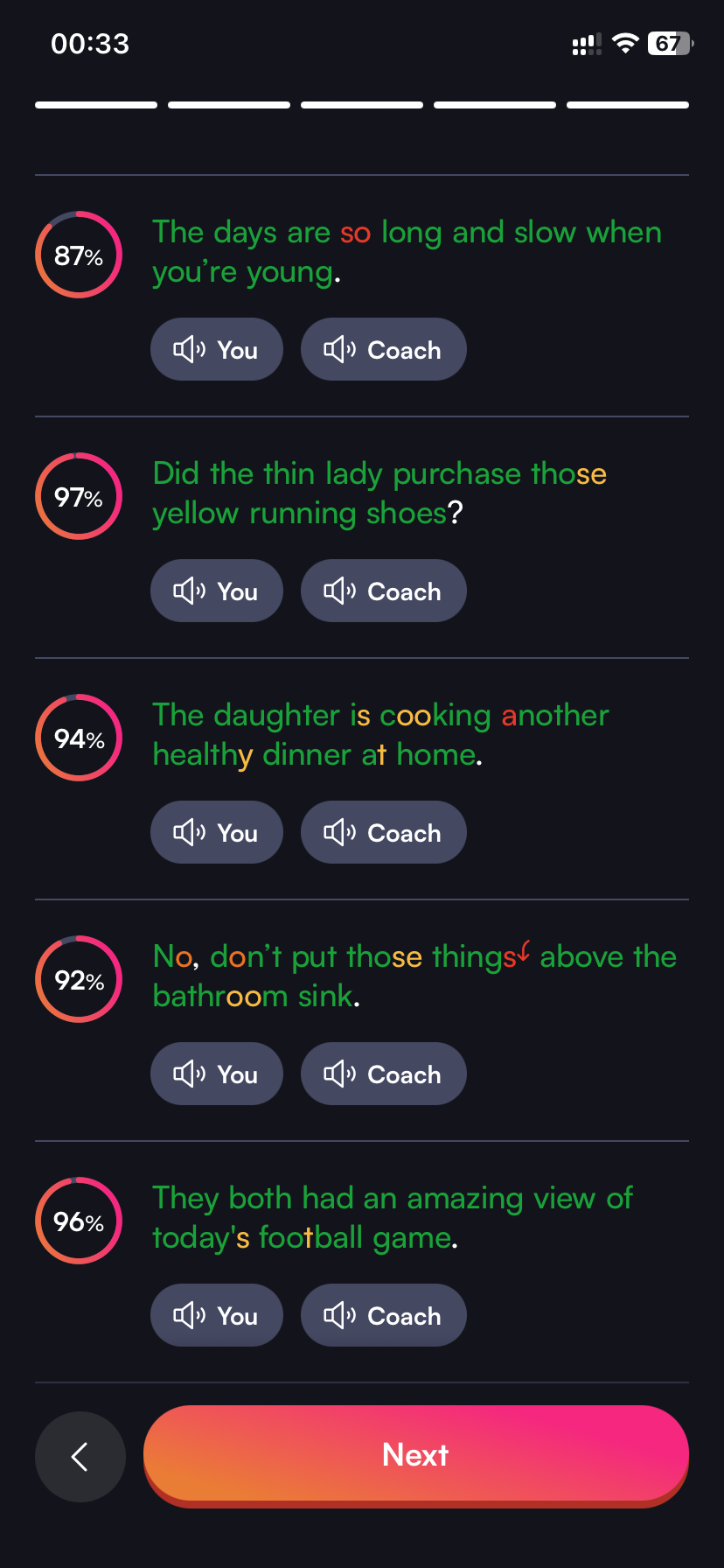Сильно легче общаться с носителями стало. Пару друзяк (сша и ирландия) говорят мол молодцом, прогресс имеется. Плюс, стало проще понимать на слух. Из минусов только цена и медленность прогресса. На один звук уходит от 2 до 5 занятий по 30 минут. Еще проблема в том, что пока звук не будет автоматическим, правильно произносить будешь только когда контролируешь. Вот это говно отработать очень долго и тяжело. Нужно много в слух читать с контролем произношения.