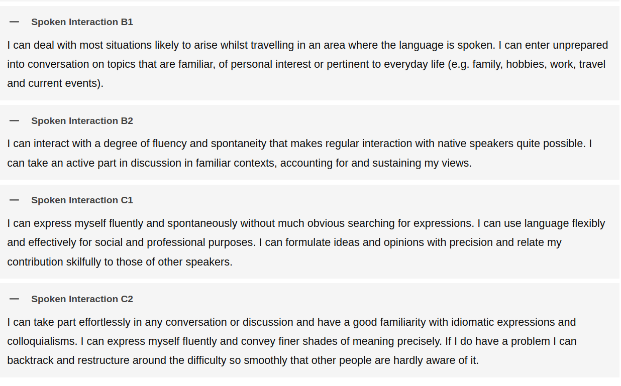При этом критериев к акценту и точному произношению нет ни на одном уровне, даже на C2. Хотя надо учитывать, что экзамены принимают люди, если у них уши буду вянуть, то вряд ли они тебя высоко оценят.