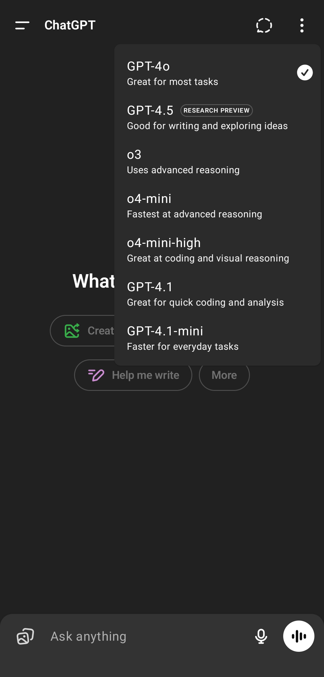 >>735034 В бесплатной версии не все модели доступны в принципе. Там есть 4.1 (не мини), 4.5, последняя с отметкой research. Например можно с Сорой играть, это видео генератор