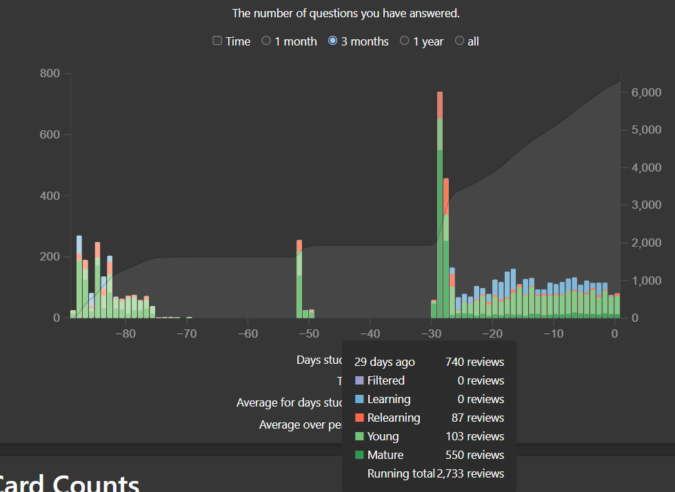 Люблю смотреть на чужие анки, так что вот свои покажу тоже и как я 2 раза проебался с ревью что привело к их забрасыванию. То есть меня сам факт проёба стрика заставил бросить, а не накопившиеся ревью, лол. И ещё вот этот вот, незапланированный перерыв, ещё раз добавил мне в копилку, того что анки работают, т.к., сразу после ревью я смог продолжить учить нихонго, так как будто бы перерыва и не было.