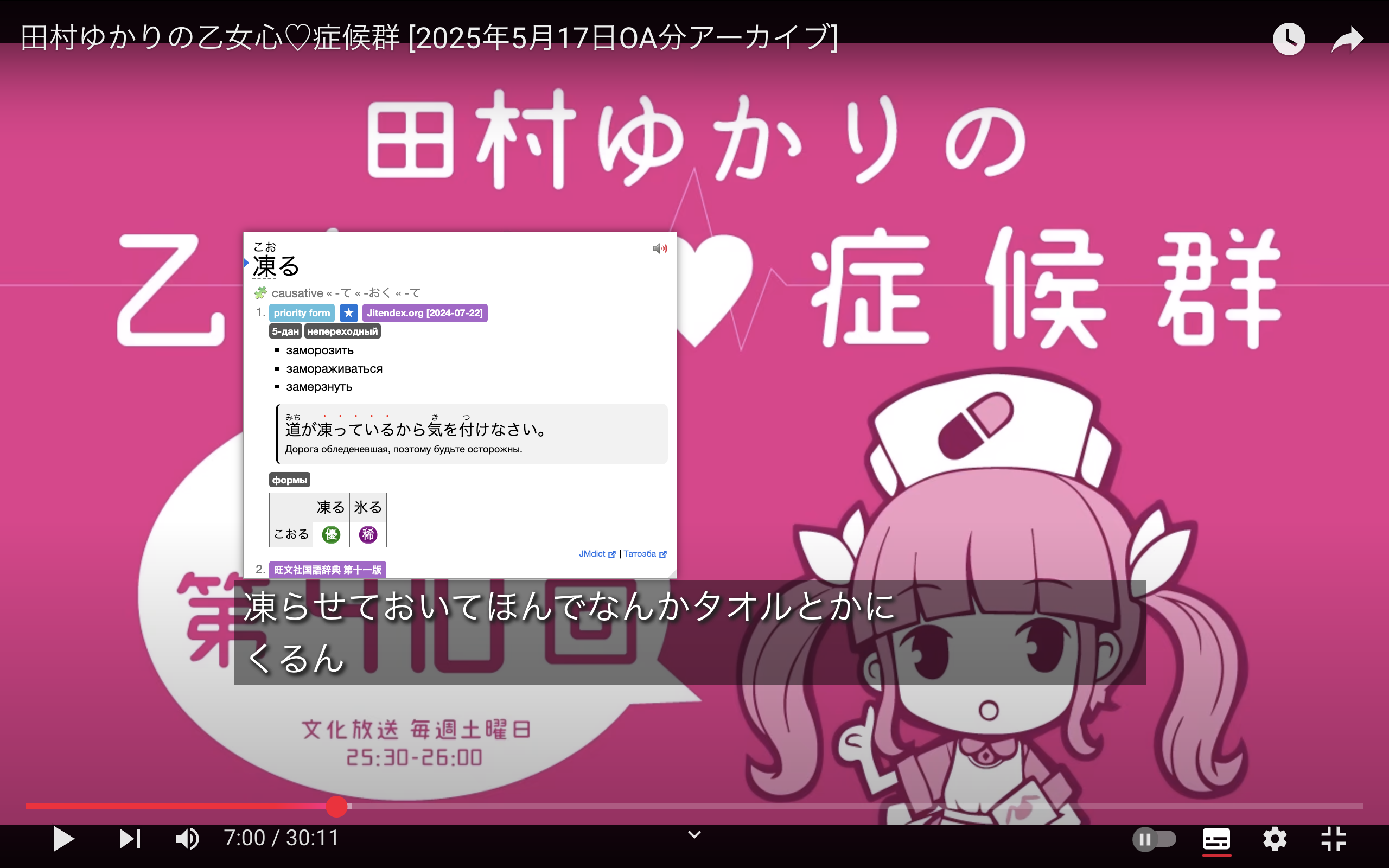 >>734245 >ну тогда выдам пост из уровня /b/ на ночь можно в наушники ставить какую-то борматание японцев или просто словарик с переводами на ру? или насколько это эффективно будет? Хуйня какая-то. Ладно уж так и быть спалю быдлу как надо учить японский с помощью YouTube: Величие ютуба проявляется в том что у него есть автосабы с точностью около 80-90%, второе величие проявляется в том, что браузерный плагин Yomitan идеально с этими автосабами работают (показываю на пикриле). Поэтому просто включаешь подкаст на свой вкус и ゆっくり разбираешь услышанное по автосабам (Я например слушаю Юкарочку https://www.youtube.com/watch?v=FWHUZIsZxho ). Можно поставить себе задачу - каждый день разбирать 10 минут (30мин/1час/) радиоподкаста. По желанию - услышанное дополнительно можно проговаривать вслух. Чем это вообще полезно? Максимально прокачивает понимание грамматики японской живой речи, отличаешь правильный акцент от неправильного и так далее. 99% студентов изучающих японский язык в языковых школах разговаривают максимально кринжово с неестественным построением предложений и я не перестаю с этого проигрывать, например в ситуациях когда японец говорит 「いや」「ちがう」изучающий говорит 「いいえ、いいえ」при этом еще и интонирование говно, и вот таких мелких вещей очень много, когда изучающий выражает свои мысли через грамматические конструкции из учебника. Предложенный способ неплохо фиксит эту хуйню.