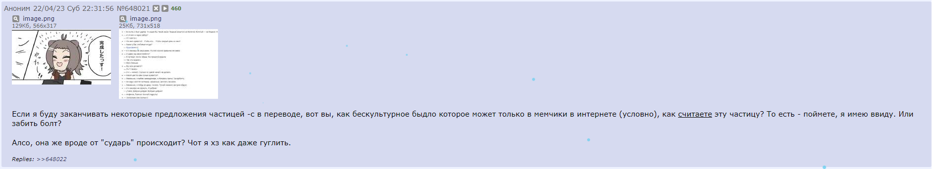 >>734268 >Всм? Nice guy имел в виду на 26 секунде, не так выразился. >В русском тоже есть 20+ способов попрощаться Да, согласен, и зачастую в русском вариация ограничивается до 2-5 разными досвиданиями но я не представляю как в будущем буду все это в голове держать. >>734273 >奴 >"奴 (nô, yatsu, つぶね)" (на английском это "slave" или "servant") – это японский иероглиф (кандзи), который имеет несколько значений в зависимости от контекста. Он может обозначать раба, слугу, а также употребляться в разговорной речи как местоимение третьего лица ("он", "она", "это") в значении "тот" или "те". В более грубой и неприличной форме может также обозначать мужчину. Пиздец, голова пухнет, ещё и диалекты..