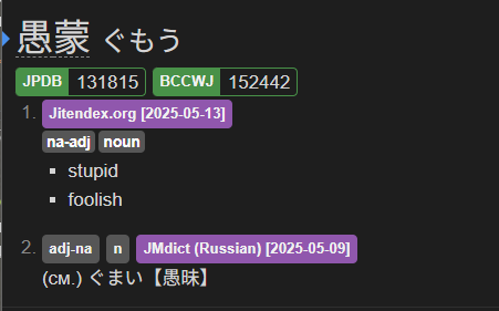 >>734988 У тебя аддон какой-то? Я про сам сайт jpdb.io, там инфа про частотность этого слова не выдается, неведомо почему: https://jpdb.io/search?q=愚蒙&lang=english#a Обычно там это указыввется в верхнем правом углу, можно легко проверить с любым другим словом. >>734990 Двачаю, тем же методом пользуюсь.