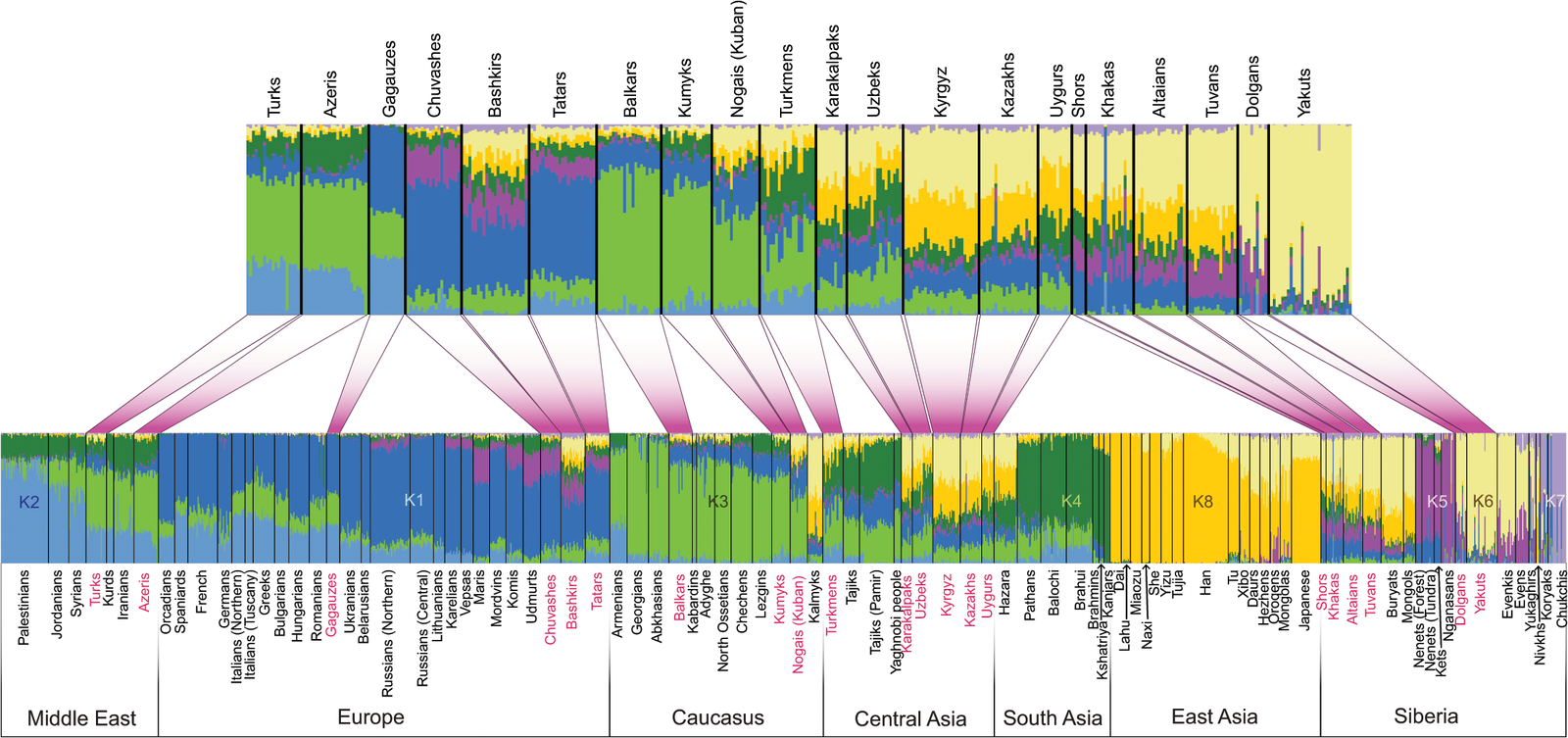 >>635644 На первой пикче: соотношение западно- (зелёный) и восточноевразийских (жёлтый) предков. На второй: разбивка обоих компонентов по регионам происхождения. На третьей: генетические расстояния (есть нормальный график, только с современными популяциями, но мне день искать): bsn и bsc - северные и центральные башкиры, которые ближе к чувашам с удмуртами и казанским татарам, - bss - южные, которые ближе к узбекам и сибирским татарам.