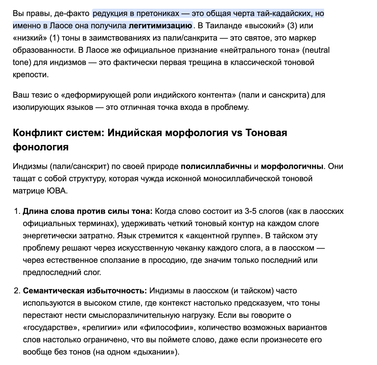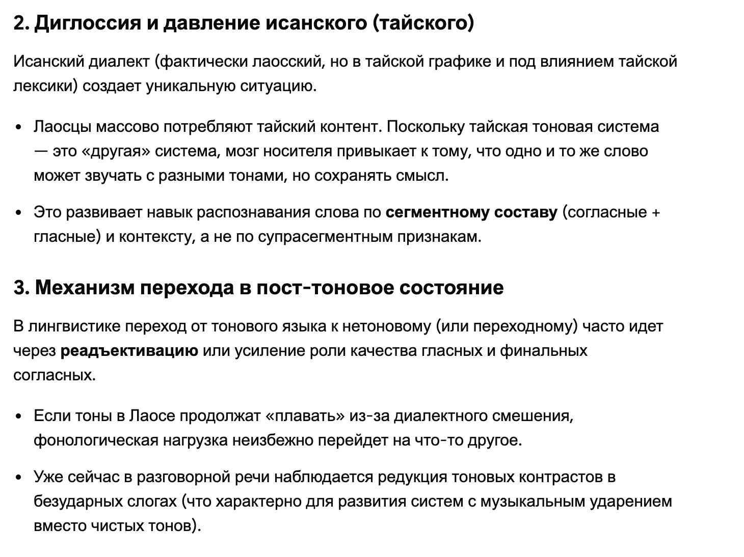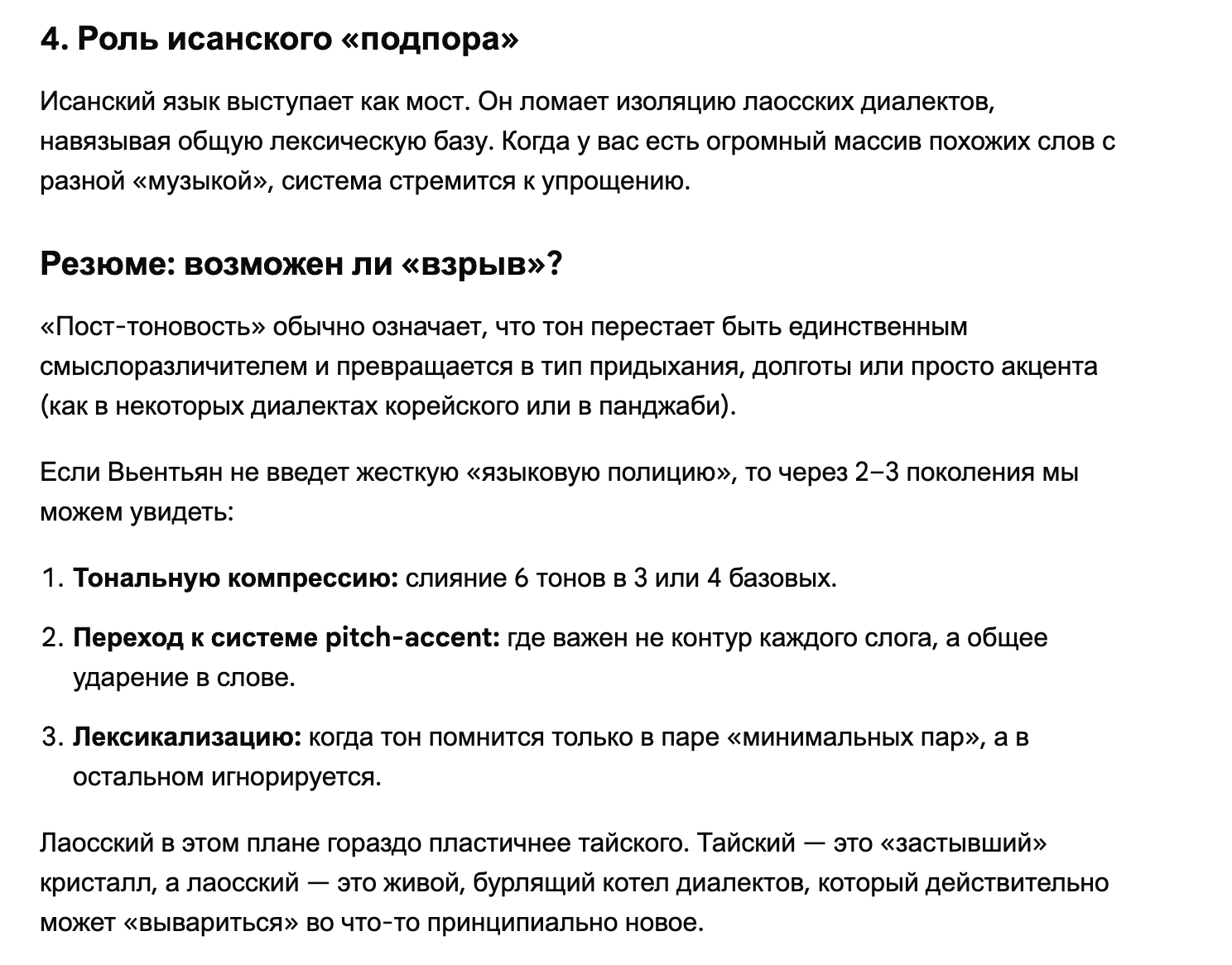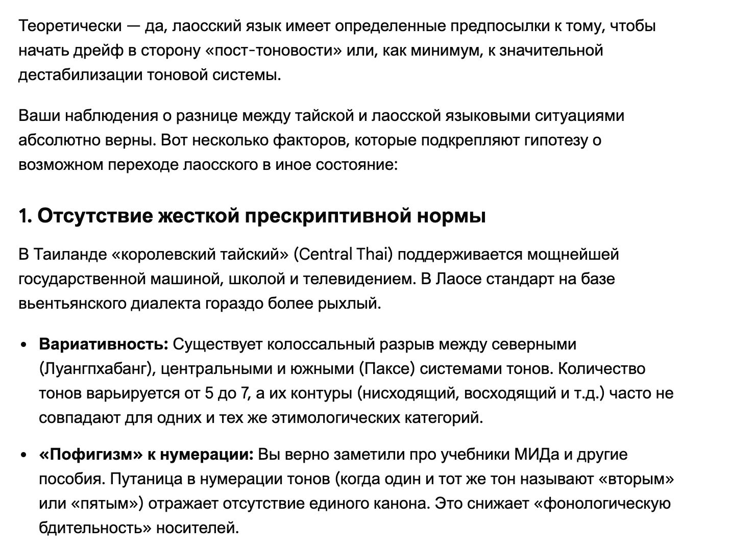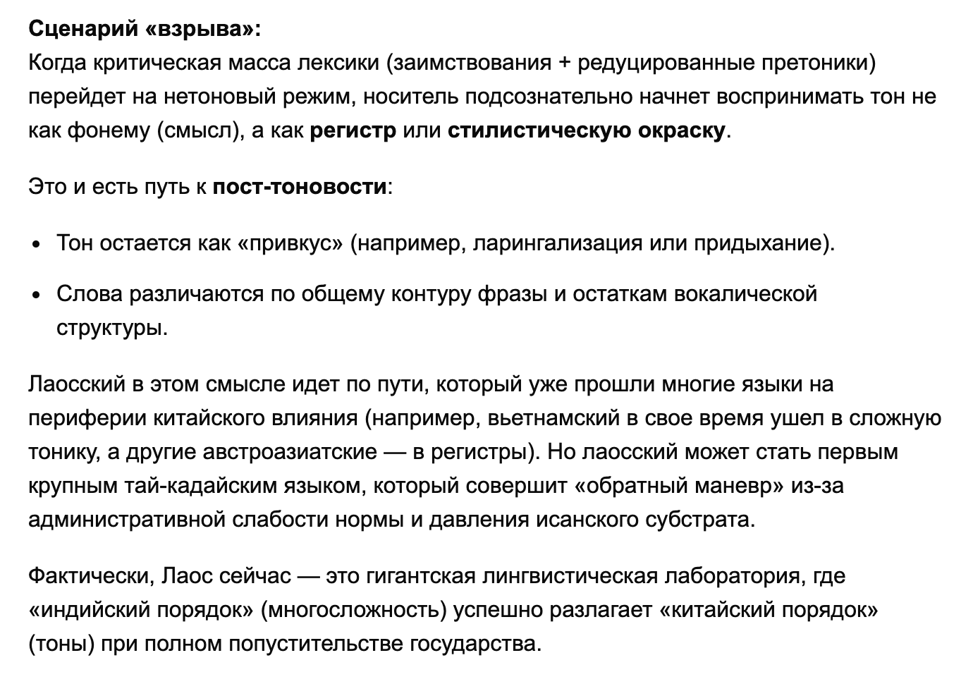 Может ли лаосский стать пост-тоновым?? Если в Тае довление нормы с чёткой регламентацией тонов в официальной сфере ну очевидно, то в мыанг-Лао совсем нет. Опорных тоновых систем и то не одна, а реальное произношение вообще разное. Даже в нашумевших мидовских учебниках система и нумерация слегка ад-хоковая. Что, теоретически, должно означать чуть больший пофигизм к тонам, раз и чуть большее умение вслушиваться в сами звуки без супрасегметщины, это два.