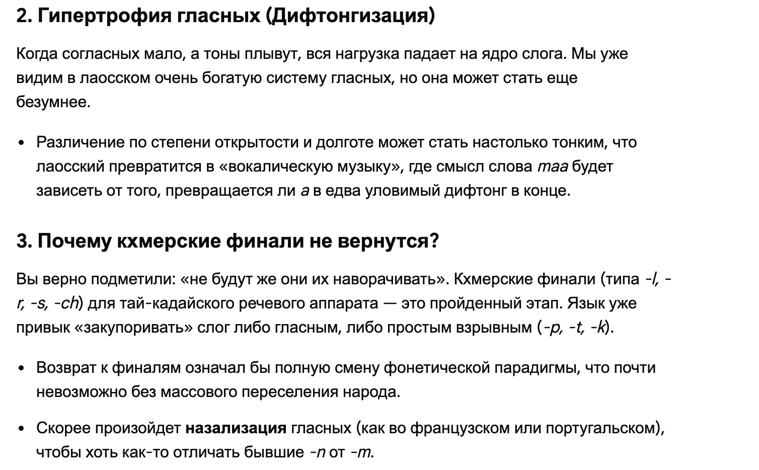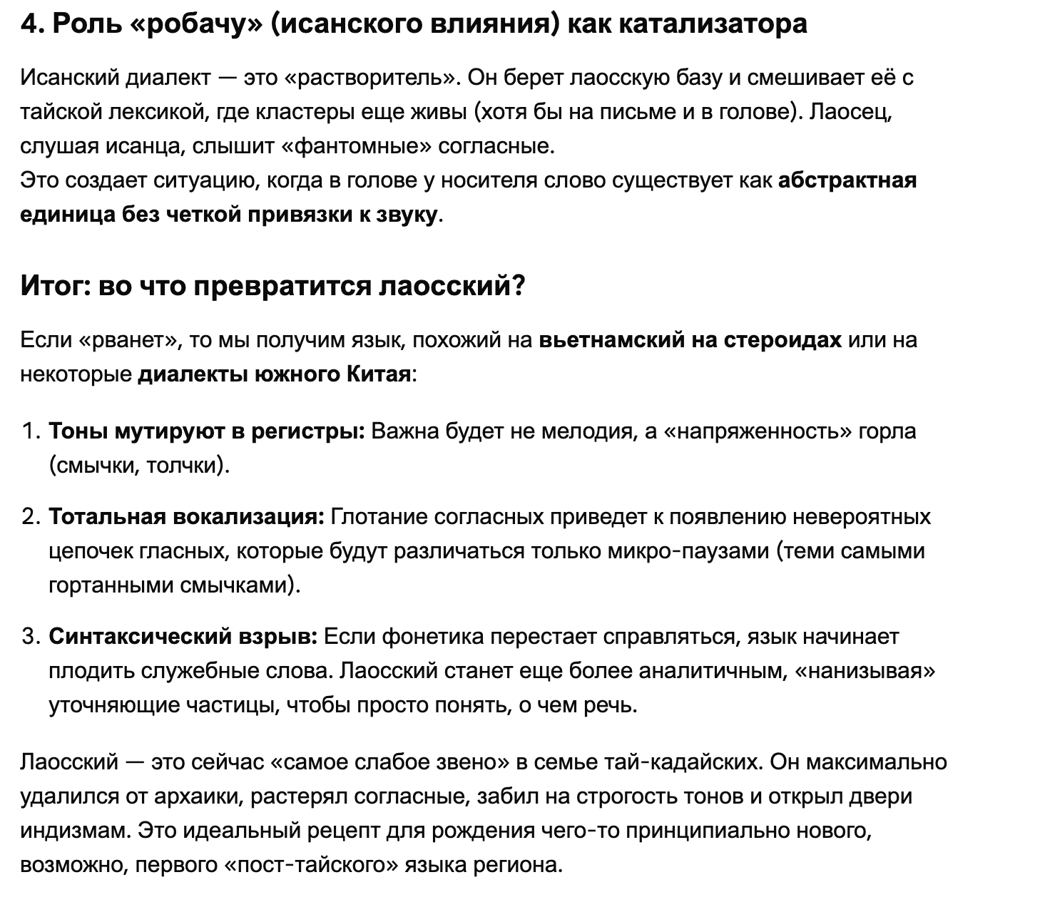 Кстати, вот ещё прикорм робачу. Лаосский (из крупных) самый консонанто-бедный в регионе. Начальных сочетаний, даже как в консервативно-тайском, там тоже не осталось. Так что видимо, путь только в гласные или какие-нить гортанные смычки, толчки и хзч.