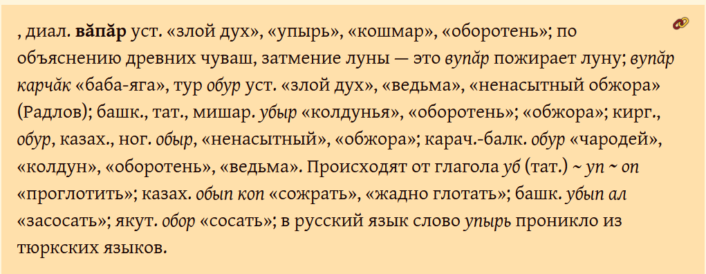 >>707837 >Турецкий мало говорит, они много что похапали у балканских потурченцев. Kral хотя бы. Прям вот так, без ı. ну там этимология есть, да и o- необъяснимо из славянских. А с чем связывать чисто славянского упиря? С выпивкой? хз вообще, темное слово.