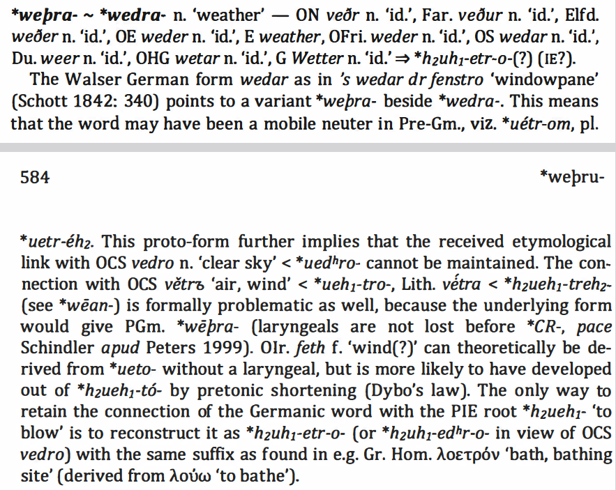>>713474 когнат только корень, суффиксы разные. В древнеанглийском было значение в том числе "ветер, буря". А вот вёдро с этим не связано. Интересно, что в русском погода - может употребляться в смысле "хорошая погода", а у суровых германцев наоборот, "погода вообще" от "плохой погоды". Что русскому плохо, то германцу подгоняет драккары.