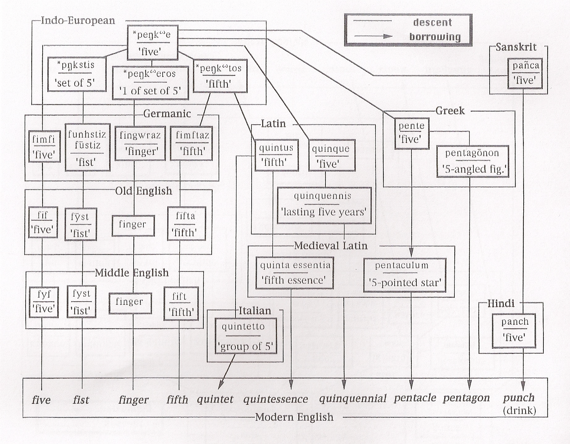 "В русском языке праиндоевропейское начальное p сохранилось, а в английском в некоторый момент его предыстории перешло в f . Поэтому в родственных словах этих двух языков имеет место соответствие «русск. начальное п - англ. f », например: пять - five, плыву - flow, полный - full, пясть - fist, пена - foam, паром - ferry"