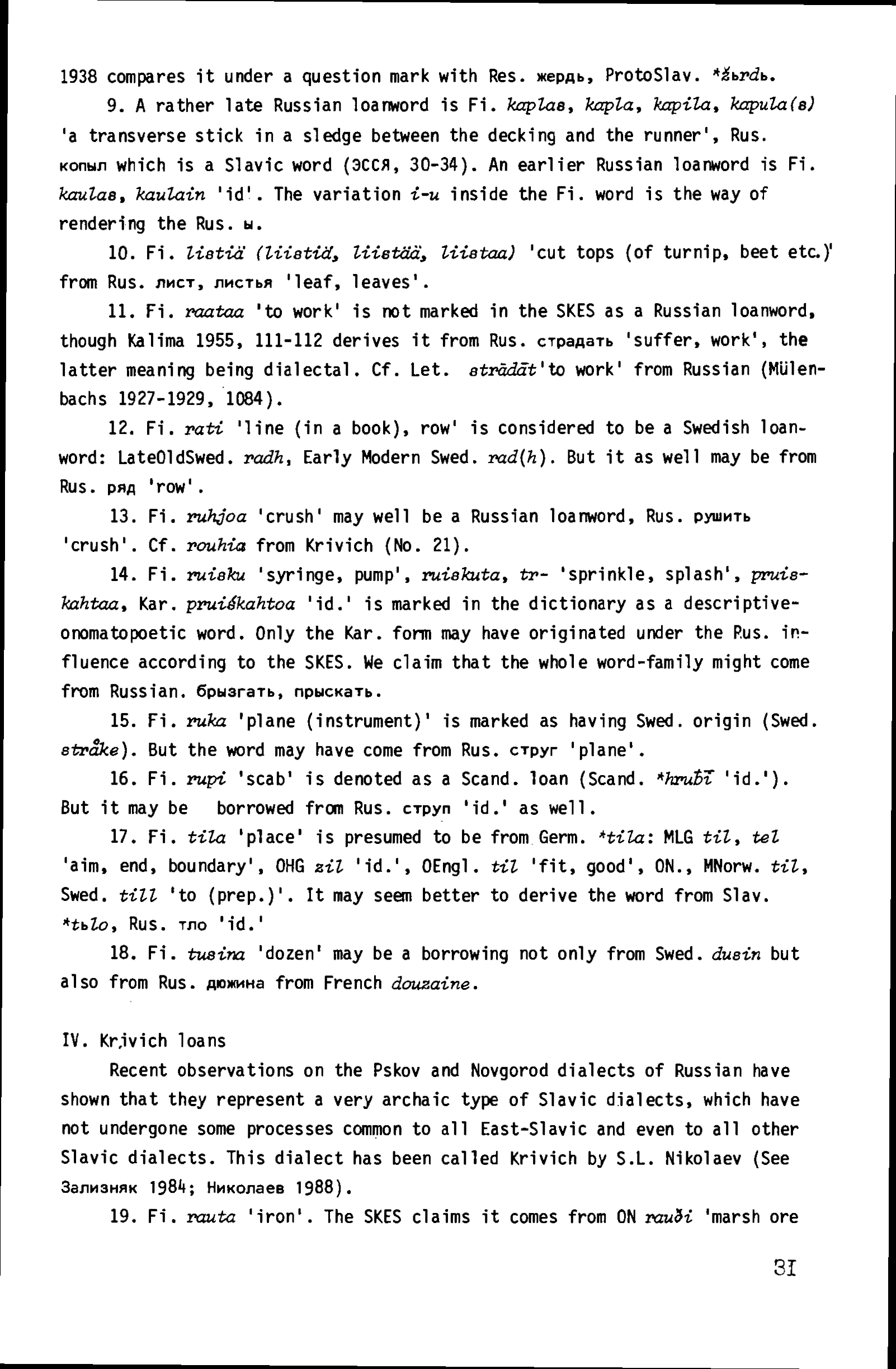 >>708246 Word: ки́вер Near etymology: "военный головной убор", др.-русск. киверъ, впервые в 1378 г. у митрополпта Киприана; Киверевъ, фам., 1495 г. (Тупиков); др.-русск. киверь -- то же, иногда также "свадебный венец" (ХV в.; см. Соболевский, РФВ 70, 80), укр. ки́вер, польск. kiwior "тур. повязка на голове, тюрбан". Further etymology: Темное слово. Существующие этимологии неудовлетворительны. Заимствование из прибалт.-фин. *küvär, эст. küvar "шляпа, шапка" (Кипарский, Baltd. 160) невероятно ввиду знач. польск. слова. Нет оснований говорить о нж.-нем. kiever как источнике этих слов также из-за значения (знач. нж.-нем. слова -- "челюсть, скула"), вопреки Соболевскому (там же). Брюкнер (231) также предполагал вост. происхождение, не указывая источника, затем (ZfslPh 16, 206) -- заимствование из ср.-греч. κιβώριον, но в таком случае осталось бы неясным наличие русск. е. Сомнительно также родство с кива́ть (по Брюкнеру, РF 6, 592; против см. Бернекер 1, 680) с исходным знач. "головной убор с развевающимся султаном" (Бернекер, там же); недостоверна в фонетическом отношении связь с ковыля́ть и коври́га (Ильинский, ИОРЯС 24, 1, 123). Связь с др.-греч. κίδαρις "вид перс. тюрбана" (Филон, Полл.) (см. Тиктин 1, 347) маловероятна исторически. Ср. кидарь. Лтш. k̨ivere, k̨īveris "шлем" объясняется у М.--Э. (2, 387) из нж.-нем. kyver. Нж.-нем. слово для меня неясно.