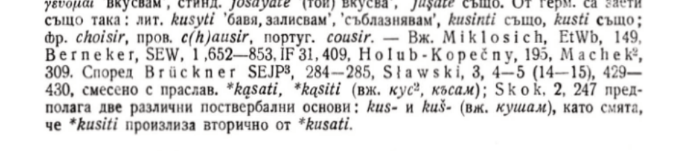 >>744892 искѹсьство писалось через ук, а не юс большой. Корень впрочем там германский, связан с англ. chose. Семантически через искѹсъ "опыт", искѹсьнъ "опытный, искушенный, знающий".