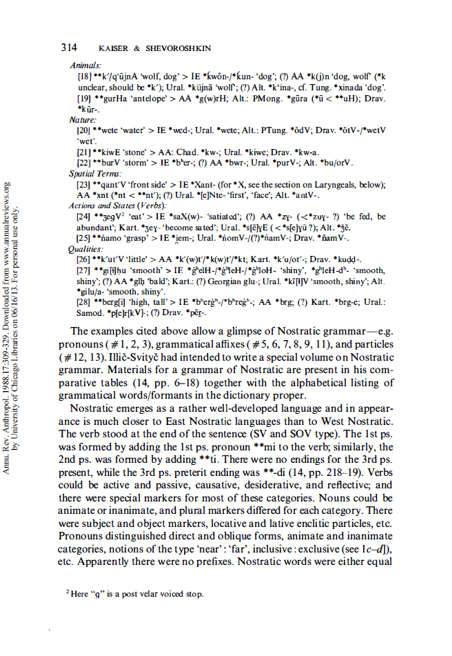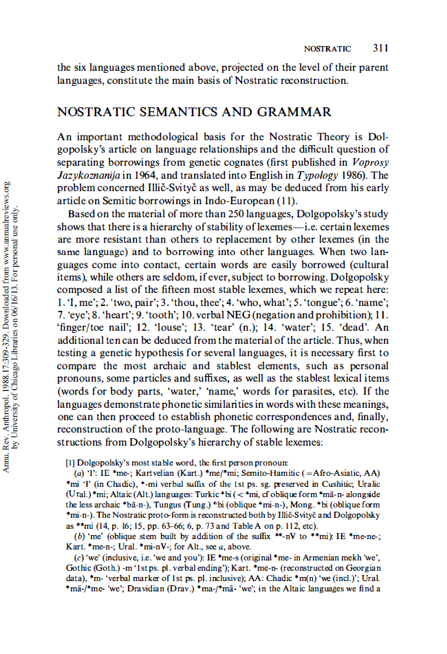 >В картвельских языках названия числительных первого десятка заимствованы из семитских языков. Даже получается, что у них был контакт не с афроазийцами, а с отдельными веточками семито-хамитских языков, именно с семитами, до распада они заимствовали систему счета. Система счета – это культурная вещь, кроме первых числительных (один, два), другие могут заимствоваться, есть такая универсалия. То есть мы можем соотнести с некоторыми такими очагами. Скорее можно сказать, что ностраты, если взять утрированно, не были монголоидами в нашем понимании, хотя сейчас там часть народа к ним относится: тунгусо-манчжуры, корейцы, японцы, частично, опять же, не все монголы, - они ярко выраженные монголоиды. Не факт, что это не простое субстратное население, т.е. местное население, перешедшее на чужой язык