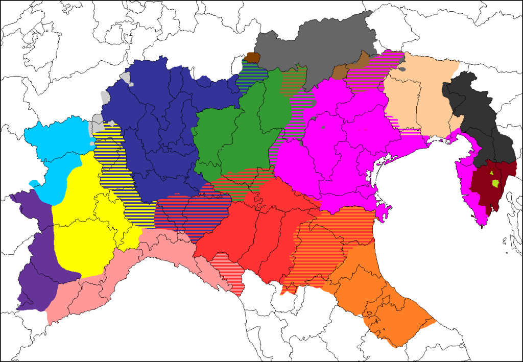 Рассматриваем и разбираем пьемонтский, ломбардский, лигурский, эмилиано-романьольский, венецианский, фриульский, ладинский, арпитанский... И местные диалекты итальянского литературного тоже. Апеннинских немцев и славян рассматривают отдельно.