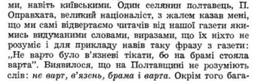 Из воспоминаний мецената-украинофила Евгения Чикаленко об откликах читателей на издававшуюся им в 1906 году газету «Громадська думка» : «Один селянин-полтавець, П. Оправхата, великий націоналіст, з жалем казав мені, що ми самі відвертаємо читачів від нашої газети якимись видуманими словами, виразами, що їх ніхто не розуміє, і для прикладу привів навіть таку фразу з газети: «Не варто було в'язневі тікати, бо на брамі стояла варта». Виявилося, що на Полтавщині не розуміють слів: не варто, в'язень, брама і варта».