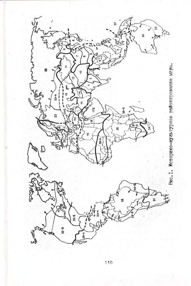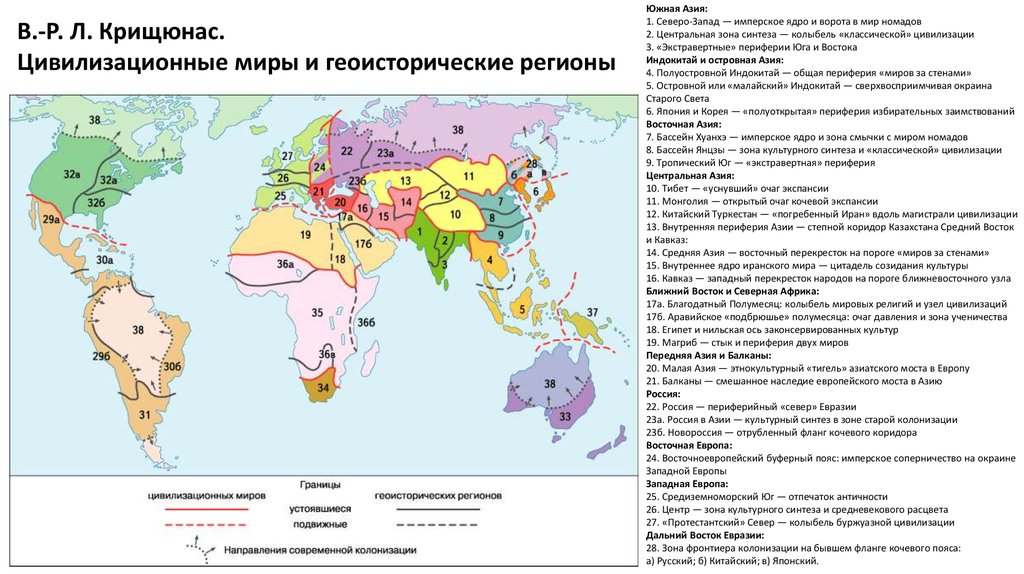 Геоисторические регионы 1 1, Северо-Запад — имперское ядро и ворота в мир номадов. 2, Центральная зона синтеза — колыбель "классической" цивилизации. 3, 'Экстравертные' периферии Юга и Востока. 4, Полуостровной Индоокитай — общая периферия 'миров за стенами' 5, Островной, или 'малайский', Индокитай - сверхвосприимчивая окраина Старою Света. 6, Япония и Корея - 'полуоткрытая' периферия избирательных заимствований. 7, Бассейн Хуанхэ — имперское ядро и зона смычки с миром номадов. 8, Бассейн Янцзы - зона культурного синтеза и 'классической' цивилизации. 9, Тропический Юг - 'экстравертная' периферия. 10. Тибет — 'уснувший' очаг экспансии. 11. Монголия - открытый очаг кочевой экспансии, 12. Китайский Туркестан - 'погребенный Иран' вдоль магистрали цивилизаций. 13. Внутренняя периферия Азии - стенной коридор Казахстана. 14. Средняя Азия - восточный перекресток на пороге 'миров эа стенами'. 15. Внутреннее ядро иранского мира - цитадель созидания культуры. 16. Кавказ - западный перекресток народов на пороге ближневосточного узла. 17а. Благодатный Полумесяц колыбель мировых религий и узел цивилизаций. 17б. Аравийское 'подбрюшье' полумесяца: очаг давления и зона ученичества. 18. Египет и нильская ось законсервированных культур. 19. Магриб - стык и периферия двух миров. 20. Малая Азия - этнокультурный 'тигель' азиатского моста в Европу. 21. Балканы - смешанное наследие европейского моста в Азию. 22. Россия — периферийный 'север' Евразии. 23а. Россия а Азии - культурный синтез в зоне старой колонизации. 23б. Новороссия — отрубленный фланг кочевого коридора. 24, Восточноевропейский буферный пояс: имперское соперничество на окраине Западной Европы. 25. Средиземноморский Юг - отпечаток античности. 26. Центр — зона культурного синтеза и средневекового расцвета. 27. 'Протестантский' Север - колыбель буржуазной цивилизации, 28. Дальний Восток Евразии - зона фронтиера колонизации на бывшем фланге кочевого пояса: А — Русский, Б — Китайский, В - Японский. 29. Америко доколумбовых цивилизаций - евроиндейский культурный сплав А - Мексиканский сектор, Б - Андский. 30. Логинская Америка вне орбиты автохтонных цивилизаций — евронегритян— ский сплав: А — Карибский сектор, Б ~ Бразильский. 33. 'Девиантная' Латинская Америка в умеренном поясе поздней колонизации. 32 Североамериканский плавильный тигель: А - область 'присадки' от Европы, смотревшей в будущее: Б - область 'присадки' от Европы, уходившей, В - зона недавнего фронтиера. 33. Последний фронтиер Европы - Австралия и Новая Зеландия. 34Южная Америка — столкновение переселенческих, европейской и африканской, культур 35. Африка тропических лесов— локальные мирки, разделенные лесными дебрями, 36. Африканские 'берега', опаленные инокультурным воздействием: А и Б - ио- ламизованные Сахель и Суахили; В — фланг евроколонизации. 37, Разбросанный мир Океании, 38. Редконаселенные убежища сминаемых внешним воздействием традиционных культур мальве народов.