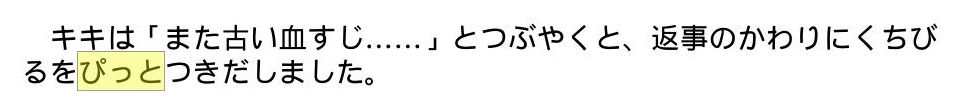 Как бы вы интерпретировали ономатопоэтическое словечко спикрила? Так-то похоже на простую вариацию ぴんと в значении 真っ直ぐに伸ばしてゆるみなく張っているさま (типа когда кто-то обиженно надувает губки, они их вытягивают), но пруфов нет.