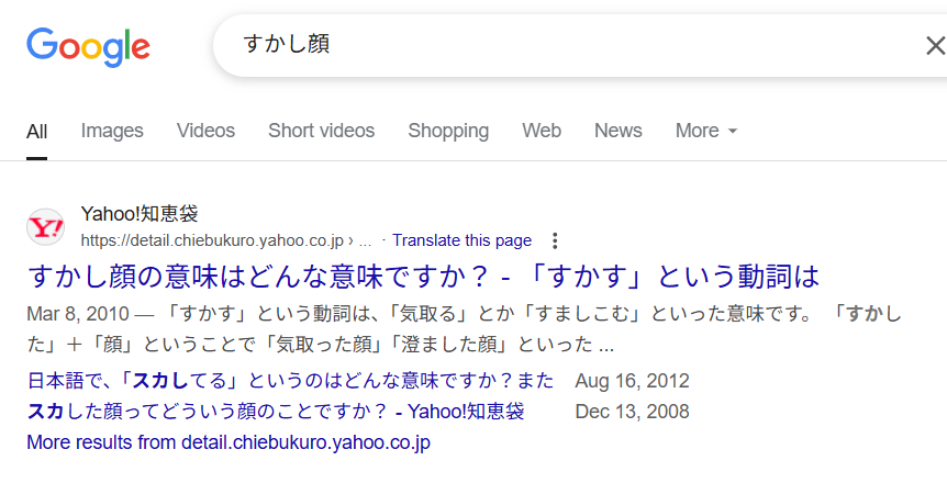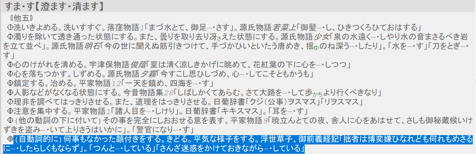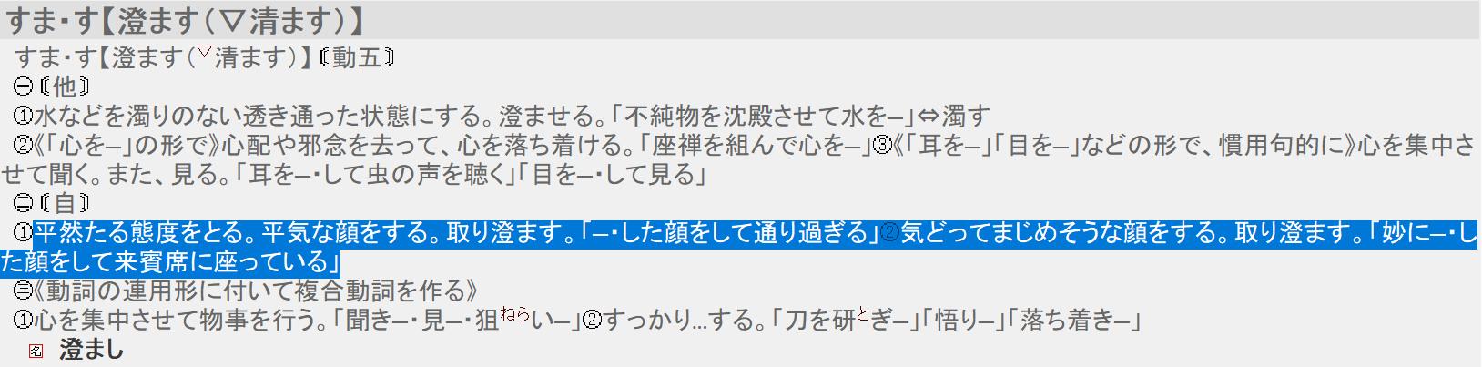 > "задаваться, выделываться" > оно уже скорее значит "напускать на себя серьезный вид, позируя" > Хотя мне кажется, что японцы ощущают это все оттенками одного значения. 澄ます означает выглядеть спокойным, серьёзным, невозмутимым, ещё пишут держаться важно, и помимо этого делать намеренно такой вид, в том числе вид, как будто ты ни при чём, ты не в курсе, тебе похуй, и т.п. И вообще-то, 「澄ました顔」「澄ました表情」「澄まし顔」 и т. п. часто употребляется везде. Я щас рандомно открыл 6 томов различных ранобэшек, и в 5 из них было 澄ます в таком значении (в основном в сочетании с 顔)。 Ещё есть похожее выражение「すかし顔」。