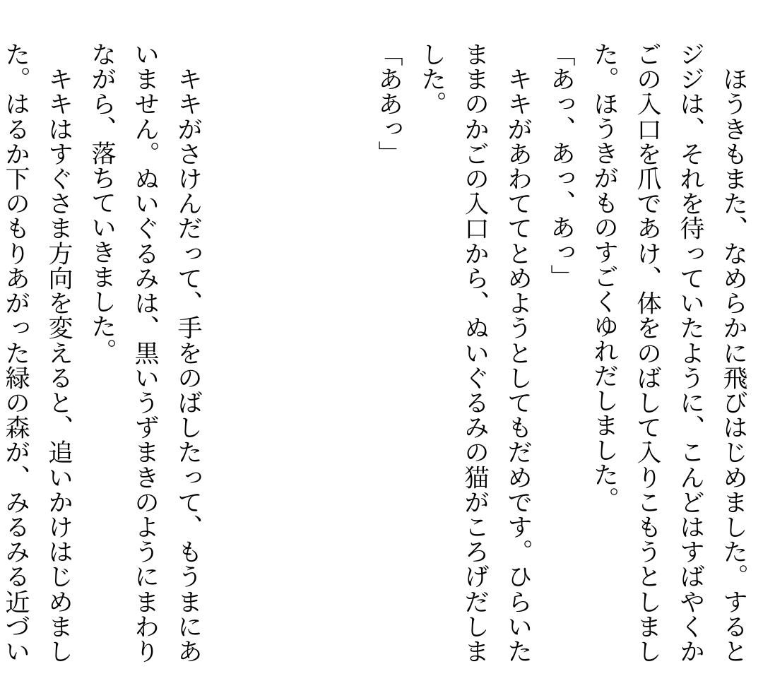 「柳の枝を川の水でさらして、そのあとお日さまにもさらしてつくったの。よくできたでしょ、ねえ、かあさん」 — тут прикольно, что 「晒す」 два раза использовано в двух разных значениях, и при этом перед в первом 「水で」, а во втором 「お日さまにも」 с 「も」. 「空気も、ほんのすこし青い感じでした」 — а почему если взлететь на три метра выше крыш, воздух может показаться голубым? Когда я на крыше девяти- и десятиэтажных домов бывал, не замечал ничего подобного. А там в деревне наверняка дома гораздо более низкие.