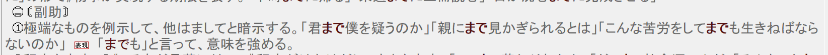 >>737486 まで может означать "аж"/"даже" (и без も), но в данном случае мне тоже кажется, что тут скорее не "аж", а просто "докуда", то есть, так же указывает предел, но без охуевания как в "аж". То есть, без まで было бы просто "куда", а с ним "докуда". Потому что по контексту тут не понятно, с чего бы с этого тут охуевать, так солнце светит у них каждый день во время заката по идее, если облаками не закрыто. > а? Ну типа было に溢れる, и вставили まで.
