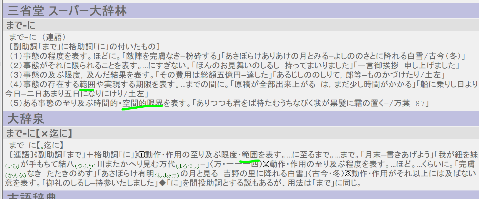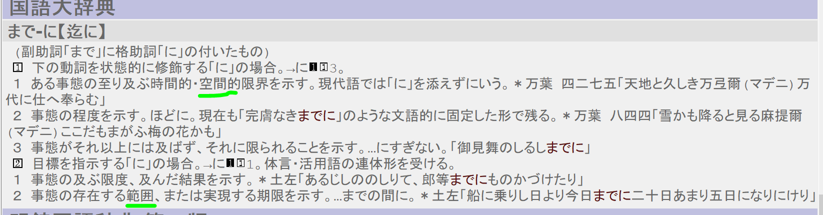 >>737525 На самом деле я не помню, чтобы встречал までに в значении "до какого-то места в пространстве", там всегда либо про время, либо про степень (程度) действия. Мб то, что я в словарях только что подчеркнул про 範囲 и 空間的, это либо устаревшее использование, либо там какой-то ебучий нюанс ещё есть, что в пространственном значении оно редко встречается. В общем, оно не взаимозаменяемое в предложениях. В книжке в том месте заменить にまで на までに теоретически нельзя.