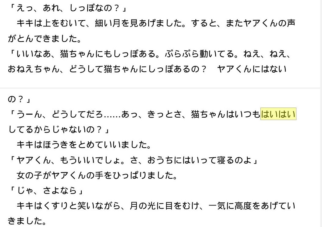 >>734529 Прочитал шестую главу. Вроде бы новые слова/словосочетания (но это не точно): 梣、ひょろん、うずもれる、穴熊、ヒートン、さばさば、かたっぽ、けんけん、うふん、突っ掛ける、かっぱ頭、ゆすぐ、ねじりん棒、靴下、テーブルクロス、結わえ付ける、用意どん、連凧、大助かり、ちろっ、すすき、窄む。 Ещё вроде бы раньше не встречал, чтобы 答 само по себе использовали отдельным словом (答をだしました). И ещё выражения 「みなまで聞かずに答える」вроде тоже не встречал раньше.