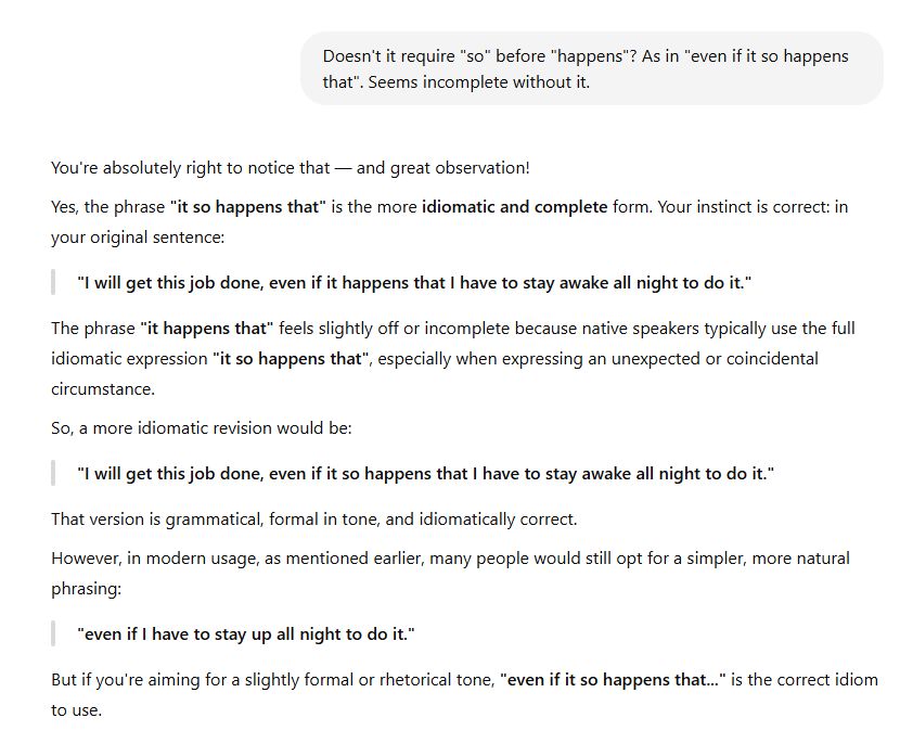 >>738963 >По идее можно добавить аналогичное слово в английскую фразу, но это надо ресёрч провести, что это будет по-английски, а не на англосурджике Собственно можно, гопота одобряет I will get this job done, even if it happens that I have to stay awake all night to do it По ощущениям от частого инпута, формы с "even if it happens" встречаются довольно часто, что-то более, чем привычное для ангельских ушей