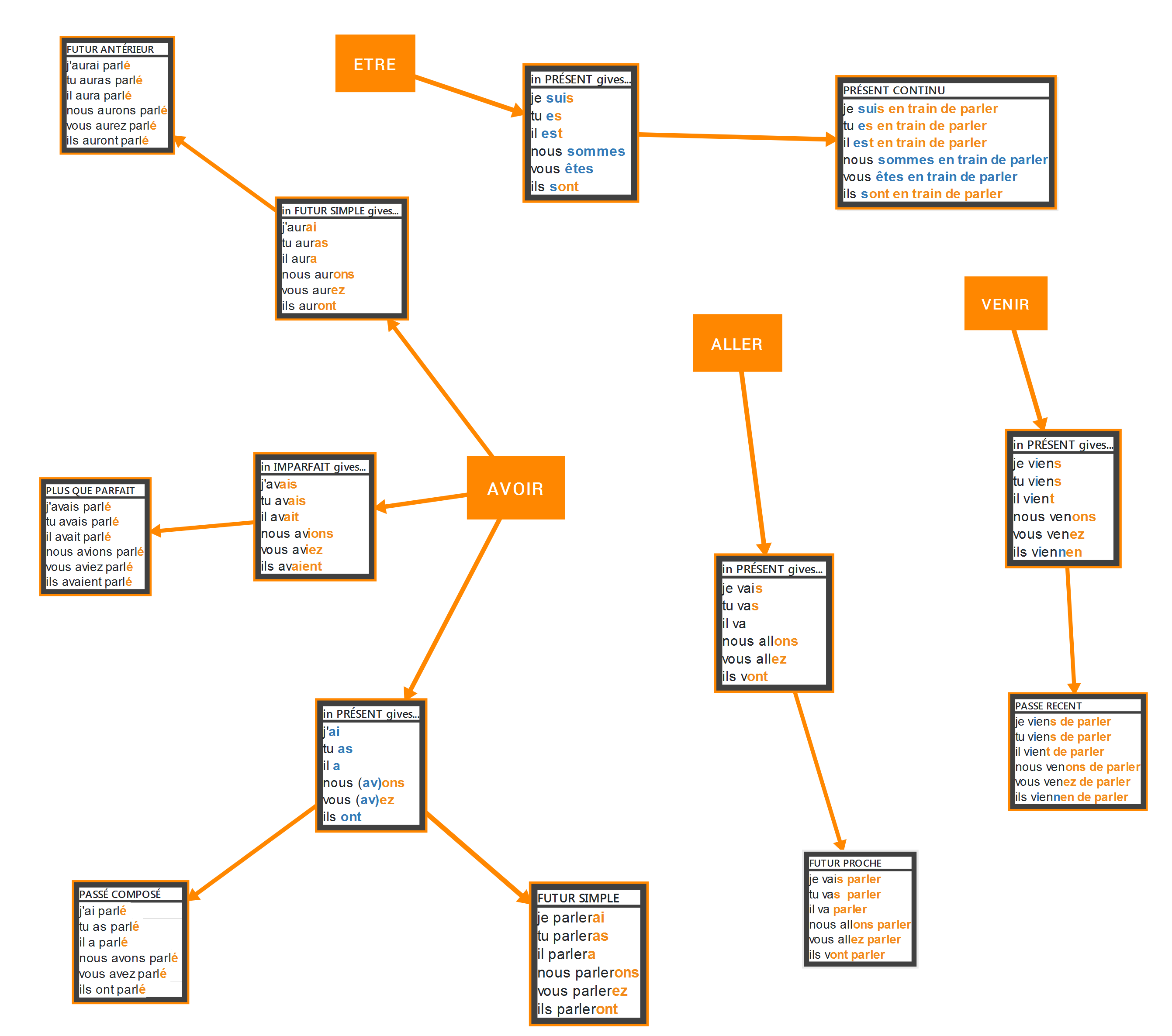 На сегодняшний день прошли по временам: imparfait, passe compose, passe immediat, present, futur proche, а также кучу сопутсвующих вещей. Основная сложность, конечно, в запоминании всех форм глаголов/причастий прошедшего времени