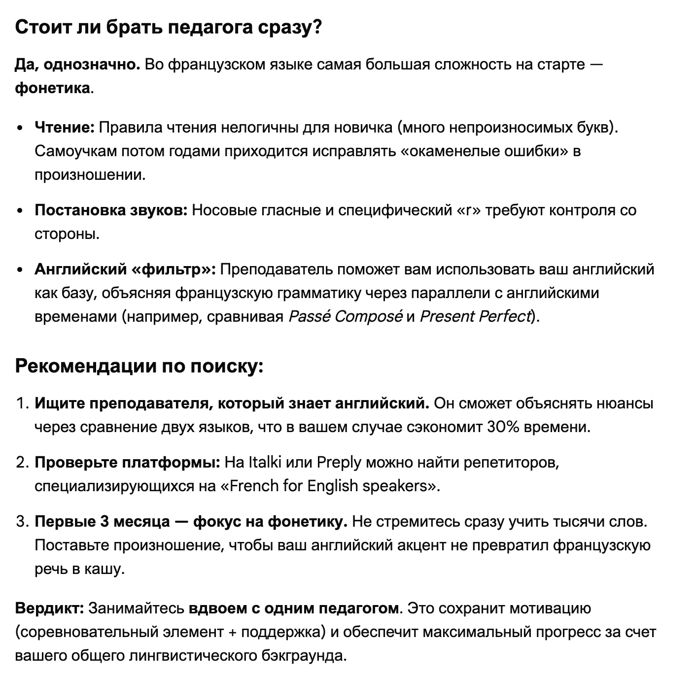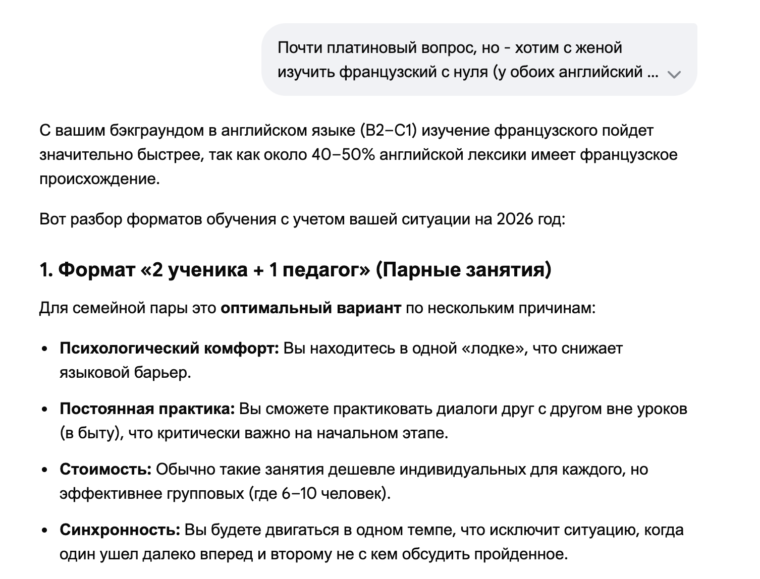 Почти платиновый вопрос, но - хотим с женой изучить французский с нуля (у обоих английский B2-C1, никогда не сдавали экзамены, но сериалы с англ. субтитрами, англ. ютуб смотрим без проблем, достаточно свободно общаемся - проучились в англоговорящей среде в университете 4 года) - стоит ли сразу взять педагога, лучше заниматься групповыми занятиями (2 ученика и 1 педагог) или лучше 1 на 1 с педагогом?