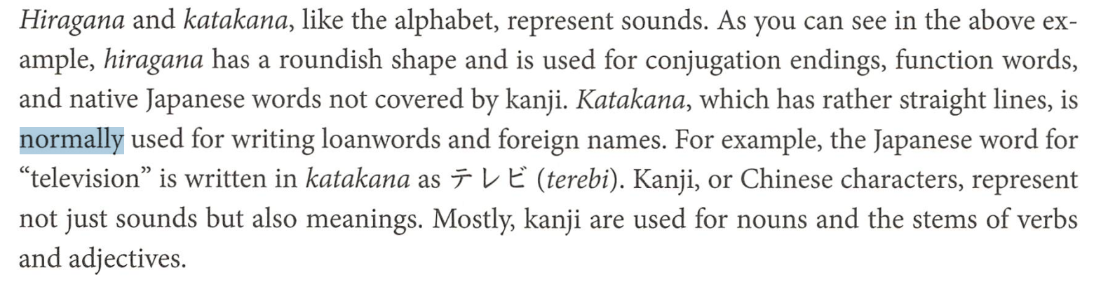 >>743590 > normally used for writing loanwords and foreign names Если катакана обычно используется для записи гайрайго, это не значит, что её нельзя использовать для записи негайрайго.