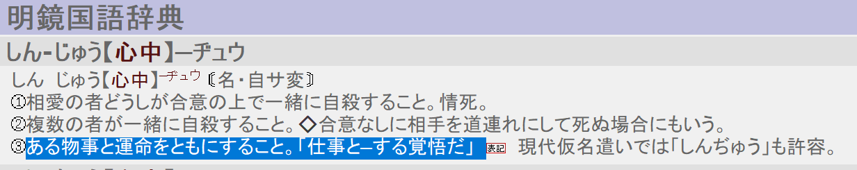 >>745192 Dedication to work это тоже очень сильная абстракция от 仕事と心中する, литературный перевод.