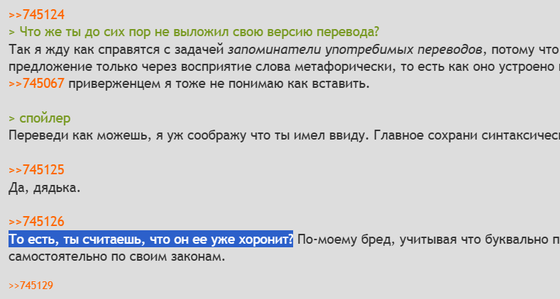 А в другой ситуации человек подумает, что к нему обращаются, например. Хуй, будешь? >>745049 как показывает история, у нас в треде иногда если контекст не соответствует выбранному варианту перевода - тем хуже для контекста.
