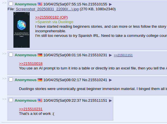 >>745086 >И увеличь время чтения в 5 раз ага Ты сколько ещё слов планируешь выучить, прежде чем пробовать книжки читать и контент смотреть? Или тебе это не интересно? >на том что нет массово людей так быстро учащих язык. Тупо ни одного пруфа что это быстро. А какие доказательства, что хоть кто-то выучил язык по Анки, тем более "быстро"? >>745085 Они очень тесно связаны, если ты умеешь свободно, быстро и грамотно писать, ты будешь уметь примерно так же и говорить, потому что суть одна: выражение мыслей. В речи может быть только физическое ограничение от непривычки мышц рта поначалу, но это с практикой быстро проходит и на способность мысли формулировать не влияет.