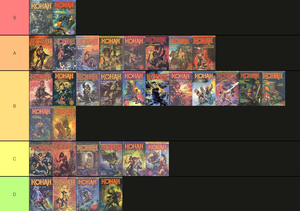S-tier: Цитадель мрака; Рука Крома А-tier: Живой ветер; Идет по следу; Сокровища Пифона; Пепел империй; Солдат удачи; Из Киммерии; Корона Кобры; Колесо страданий B-tier: Изменник; Меч на продажу; Разрушитель; Огненный зверь; Другие бессмертные; Против Звездного братства, Другие бессмертные том II; Небесная секира; Глаз Эрлика; Талисман огня; Тень Властелина; Убийца колдунов; Бегство от смерти C-tier: Гладиатор; Осквернители праха; Сердце Хаоса; Не знающий страха; В пустыне и джунглях; Дорога во мгле D-tier: У ворот Зла; Секира Света; Путь воина; Одинокий волк