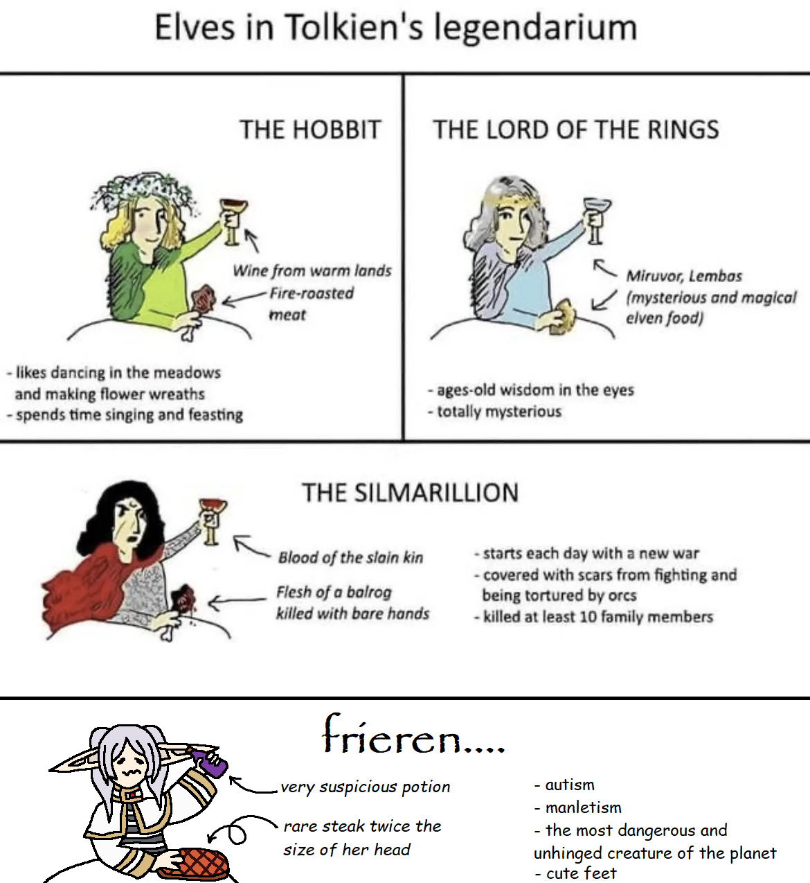 >>579855 >Общее у эльфов это любовь к мясу Самое смешное, что стереотипные эльфы - веганы и хиппи, хотя во всех самых популярных произведениях об эльфах это строго наоборот, будь то западные или восточные произведения. Откуда вообще взялся этот дурацкий стереотип?