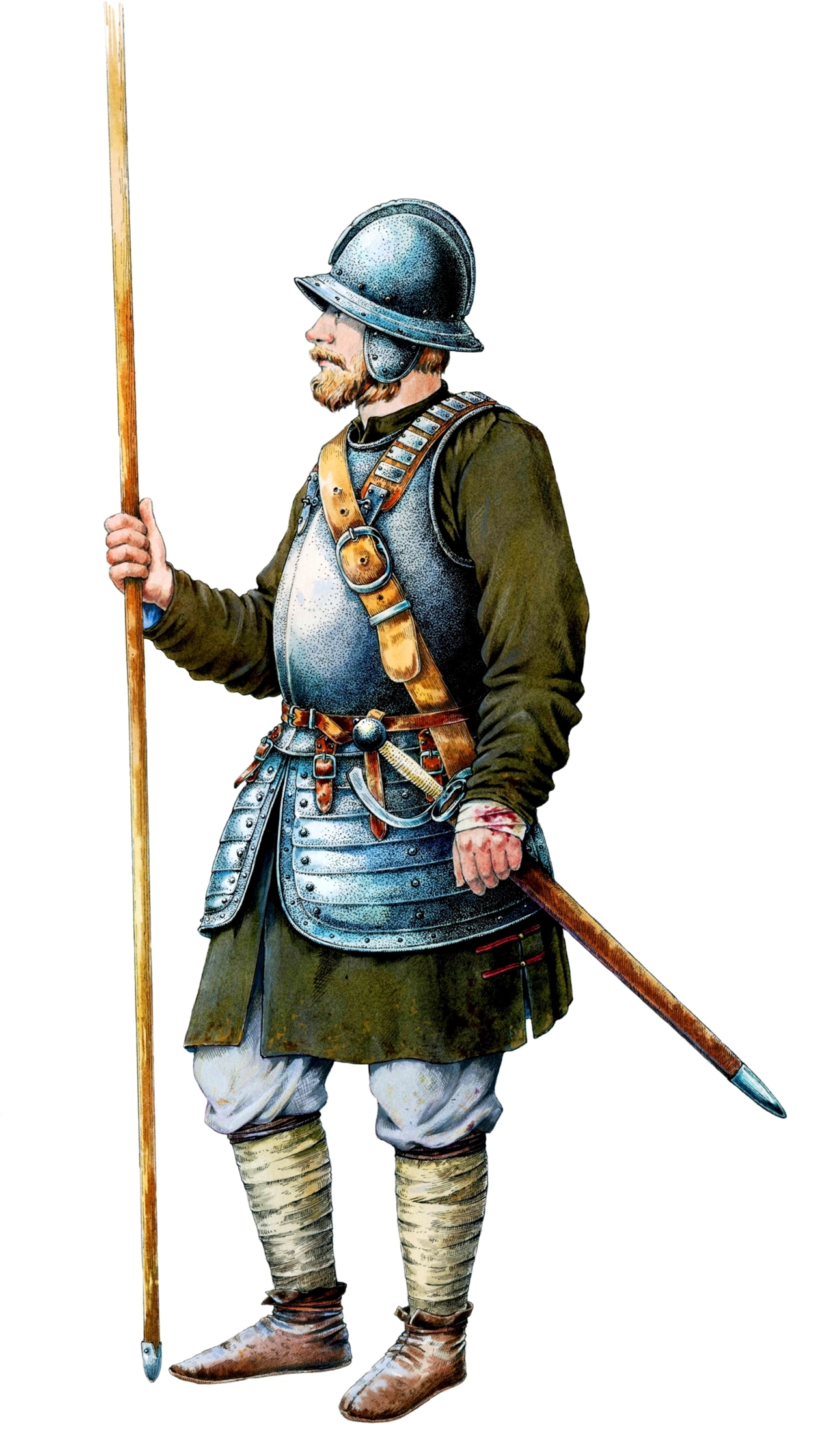 >>588863 Снаряжение кавалерии в описываемый период претерпело значительные изменения. В 1640 г. происходит быстрый отказ от трех-четвертного доспеха, который ранее был обычным атрибутом тяжелой конницы. Ему на смену приходит полудоспех (кираса и шишак), который ранее был принадлежностью легкой кавалерии. Доспехи надевалось поверх плотного кожаного камзола, пришедшего на смену прежним стеганым дублетам. Ноги закрывали высокие ботфорты из толстой кожи. Изначально подобный доспех использовали кирасиры (то есть легкая кавалерия той эпохи), поэтому впоследствии его часто называли «кирасирским». Постепенно полудоспех описанного образца стал общеупотребимым, полностью вытеснив трех-четвертные доспехи. В Англии, видимо, к концу войны состояние дел со снаряжением кавалерии обстояло именно так. Данное снаряжение оставалось практически неизменным до 1680—1690 гг. Оно распространилось и на Новый Свет, по крайней мере, на английские колонии. Другим обозначением кирасир был термин «аркебузиры» или «карабинеры», по названию того вида огнестрельного оружия, которое они употребляли помимо пистолетов.