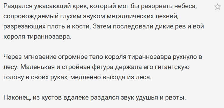 Сравнивать описанный выше филлер с Мартином, как бы кто к нему не относился - признак не то что дурновкусия, а откровенного кретинизма. И дело даже не в том, что у него лучше слог, чем у рандомного переводчика с wuxiaworld, или что диалоги лучше и интереснее, или что мир куда более детально прописан, хотя это всё так. Просто формат выпуска позволяет ему куда лучше продумать роман, при не опускаясь до хуйни выше.
