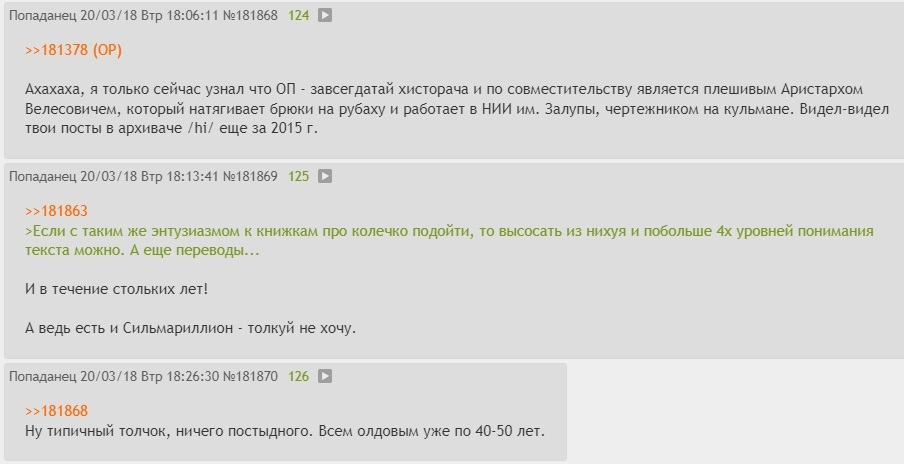 >>587642 >Когда тут вообще последний раз было В прошлом треде, блядь. Обсуждали иллюстрации, имена, великих орочьих вождей и прочую платину. Если бы не серуны, тред бы только из обсуждений и состоял. Но нет, надо насрать и спрашивать, почему воняет.