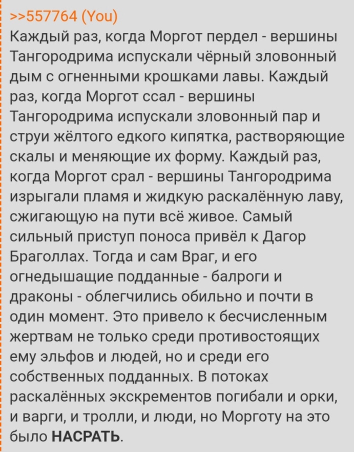 — Да хули, я сейчас расскажу, блядь — Пламя Удуна разгорится, потом будем тут, блядь… искажать всё. — У кого разгорится, у тебя что ли? — Ну а тебя что, не разгорится что ли? — С какого хуя у меня должно разгореться Пламя Удуна? От твоих историй что ли у меня должно Пламя Удуна разгореться? — Вдвоём сидим тут, блядь. — Ну давай, рассказывай, давай. — Ну… Древа выпилил, блядь, ну, два. — Угу. — С одной дурой. — Угу. — Ну, а потом она меня душила. — Бля, охуительная история просто. У меня просто Пламя Удуна так разгорелось, что, блядь, сейчас горы рушить буду. Всё что ли, просто душила и всё? — Ну быстро так, десять минут всего душила-то. А у неё потом сразу, блядь, паутина чёрт… чёрн… чёрная. Много паутины напрялося, она… ну когда самоцветы не ела просто… — Бляяя ну и истории у тебя! — Но я орать стал, блядь. Глаза закатил. Ну, завизжал, так, знаешь… Не знаю, чё нашло на меня. Визжал так, блядь, выл. — Охуительная история! — А потом это... визжал я, выл, и скалы это... раскололись, ну. А там старые кореша мои... балроги, ну... с прошлой войны прятались. Как давай кнутами дуру эту хлестать! А она это, ну, испугалась, газом чёрным перданула и свалила куда-то. Повезло, короче, ну. — Охуенно. — Ну ты лось, блядь, тебе такие истории… тоже такое, видимо, что-то было… Да ладно, ты меня всё время будешь смеяться… — Да не буду я смеяться, давай, рассказывай, как ты строил… Ангбанд. — Ангбанд, Ангбанд. Ну я Утумно потом вспоминаю, как там пещера, типа Агбанда такая… Не помню ничего… — Ну, Утумно. — Там я жил, блядь. Долго жил, кореша-балроги со мной, а с бабами напряг совсем... — А ты голубой? — Не-не, братишка, ты не подумай... мы не пидоры, блядь. Там это, ну... жарко очень было... и канализации не было совсем. — Так что же вы там, засрали всё? — Ну типа... ну все свои, привыкли уже... срали и ссали на самых нижних ярусах... там вообще жара как в бане, оно и высыхало всё моментом, только воняло сначала очень сильно, но мы привыкли, все свои типа. — Охуительная история! — Ну вот видишь! А потом всё равно ебаться охота стала, терпежу прямо нет... но ты не подумай, мы не голубые, мы получше придумали. Там южнее Утумно в лесу у моря эти появились... — Квэнди? — Да-да-да, эти самые, ну... Вот мы с балрогами их ловили, кто сильно далеко к северу заходил... ну и ты понял, братишка, да. И баб, и мужиков, и детишек — в пизду, в рот, в жопу, много малафьи налилося... — Бля, да они ж маленькие, а ты здоровый как мамонт, порвешь их всех! Это, блядь, не ебля, нахуй, это садизм какой-то! Фу, блядь! Фу, нахуй! — А они и лопалися, да... ну, рвалися и умирали. И тут я придумал сшивать их как было и это, ну... Пламенем Удуна оживлять, ну и потеха была, братишка! — Охуительная история... и что, ожили? — Прикинь, братишка, да! Только страшненькие какие-то стали и маленькие, ебать неохота совсем. Мы с балрогами придумали ими в солдатики играть — а они послушные такие... ну мы их, солдатиков, целую кучу понаделали и разводить стали, ну как этот мудак Оромэ собак своих разводит, ну. — Ебануться… — А чо ебануться-то? Знаешь как охуенно в солдатики играть? Первая колонна марширует, вторая колонна марширует... — Предел настал моих… моего внимания по отношению к тебе, всё. — Ну чё ты такой сердитый айнур-то, ну будьте людьми вы, й… ребята, я всегда вам говорю. Чего вы сразу начинаете? — Нет, я нихуя не начинаю, я от тебя вообще ничего не хочу, блядь, хочу, чтобы ты з