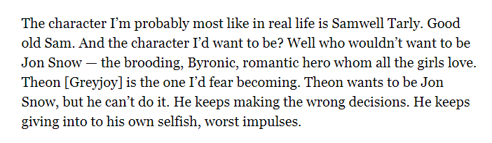 >>600738 Ты сам читал целиком, то что скинул? Почему, по мнению Жирного, Джон молодец, а Теон неоче? Потому что: >So they’re both a little outside, but Jon handles this successfully, and Theon fails to handle this. He is poisoned by his own envy and his sense of not belonging.