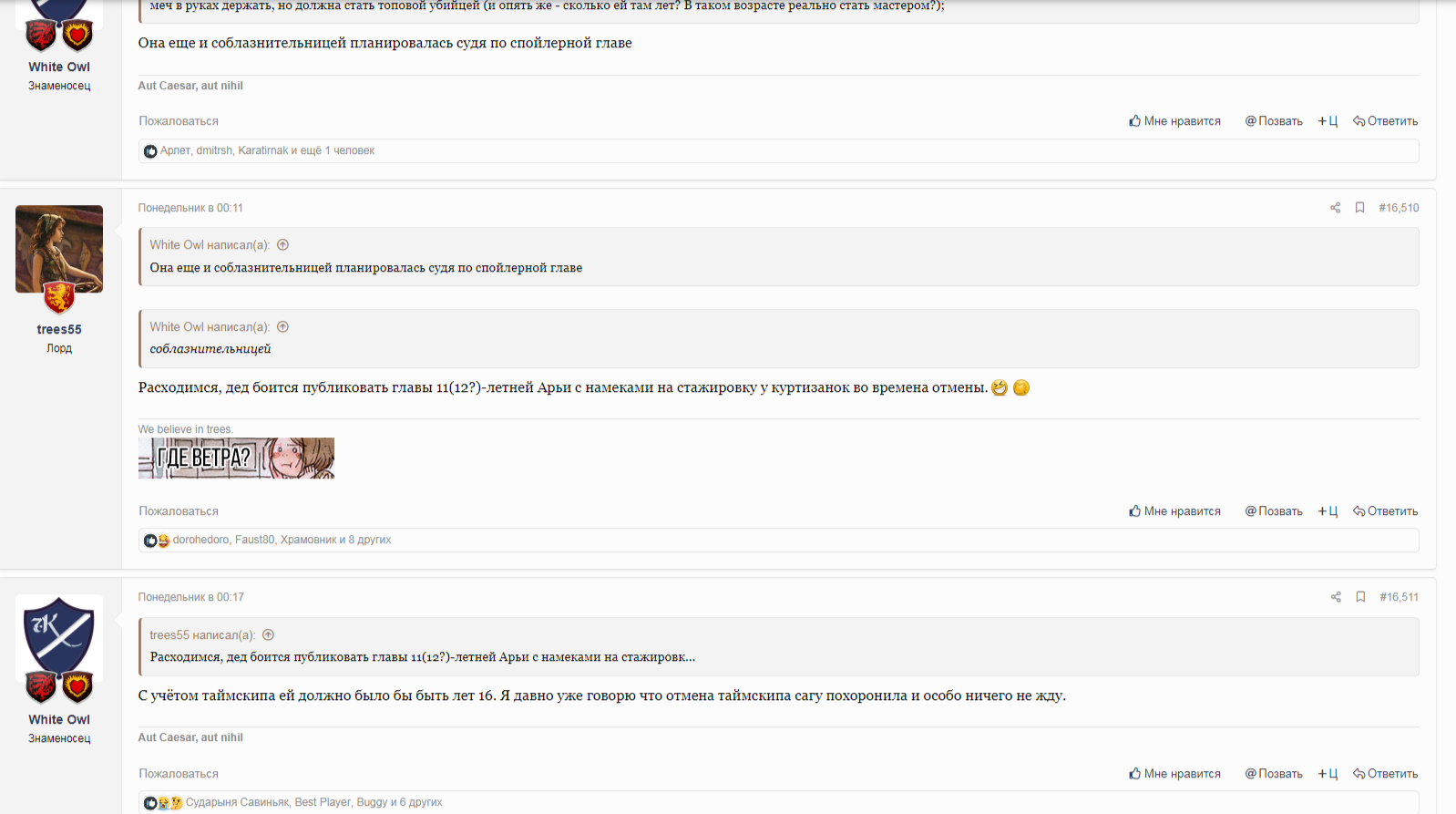 Нужно понимать одну вещь. Точнее две, но вторая это банальное "Мартин ничего не напишет, поэтому похуй". А первое: Дед в Ветрах будет максимально сокращать количество второстепенных веток. Все эти Вели, Барристаны, Виктарионы, Томмены, Мирцеллы, Арианны, Коннингтоны, Фреи и прочие будут нещадно вырезаться ввиду того, что Мартин уже пообещал что Ветра станут самой мрачной книгой. У него нет выхода, если он планирует и дальше уложиться в семь книг.