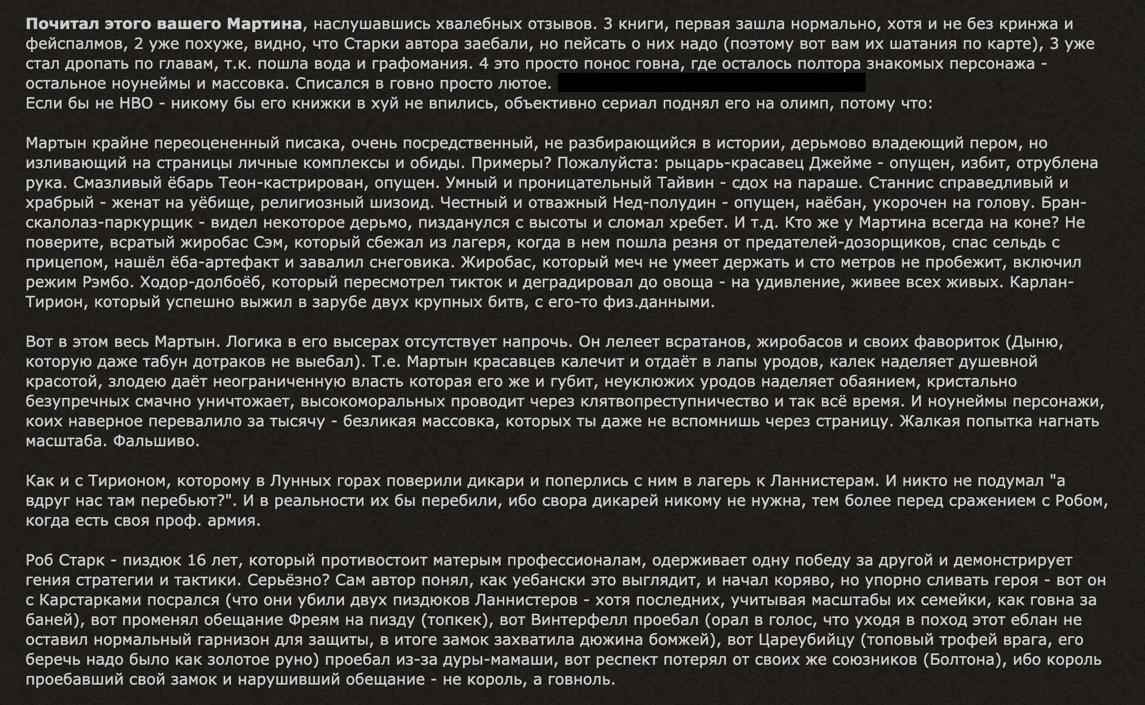 >>605458 Ты мне этим постом напомнил еще одну проблему, из-за которой я постоянно откладывал прочтение. Она заключается в том, что Мартин любит всех обоссать и обосрать. Мне больше нравится читать, как добрые гг превозмогают трудности, а не про то, какая жизнь несправедливая "неоднозначная" штука, и что в дерьме будут все. Негатива и грязи и в ирл достаточно, хочется все-таки поаутировать, а не ловить лицом струю мочи, после того как очередного героя, к которому привязался эмоционально, выебали палкой в жепу.