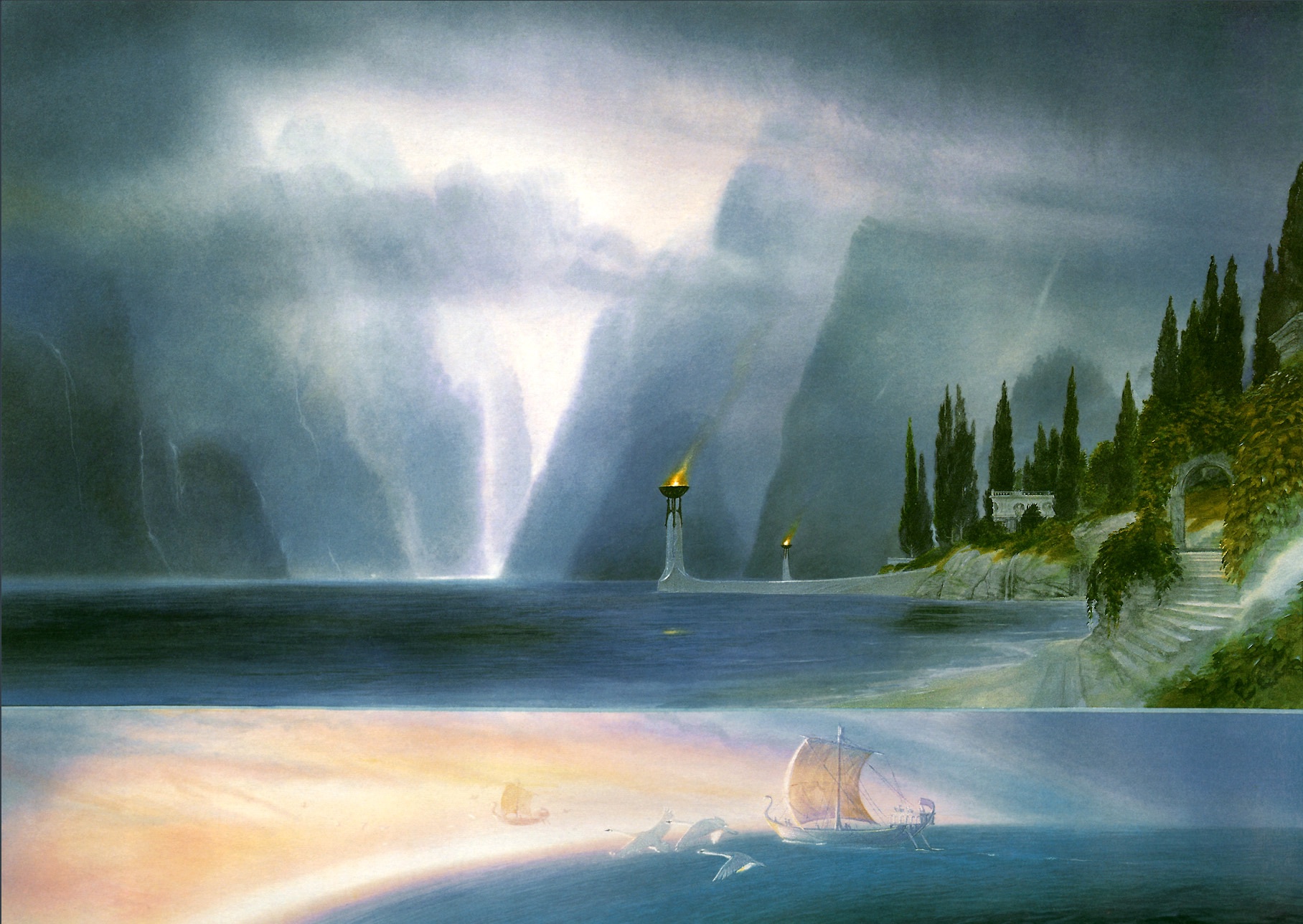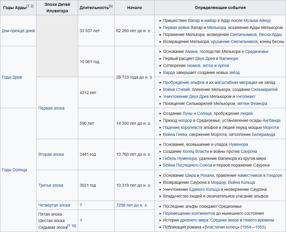 Вала Оромэ встречает новопробудившихся эльфов, 1085 год Древ. Война Гнева и падение Ангбанда, 545—587 годы Солнца. Война Последнего Союза, 3429—3441 гг. В. Э. Последние Белые Корабли эльфов уходят за Море по Прямому Пути.