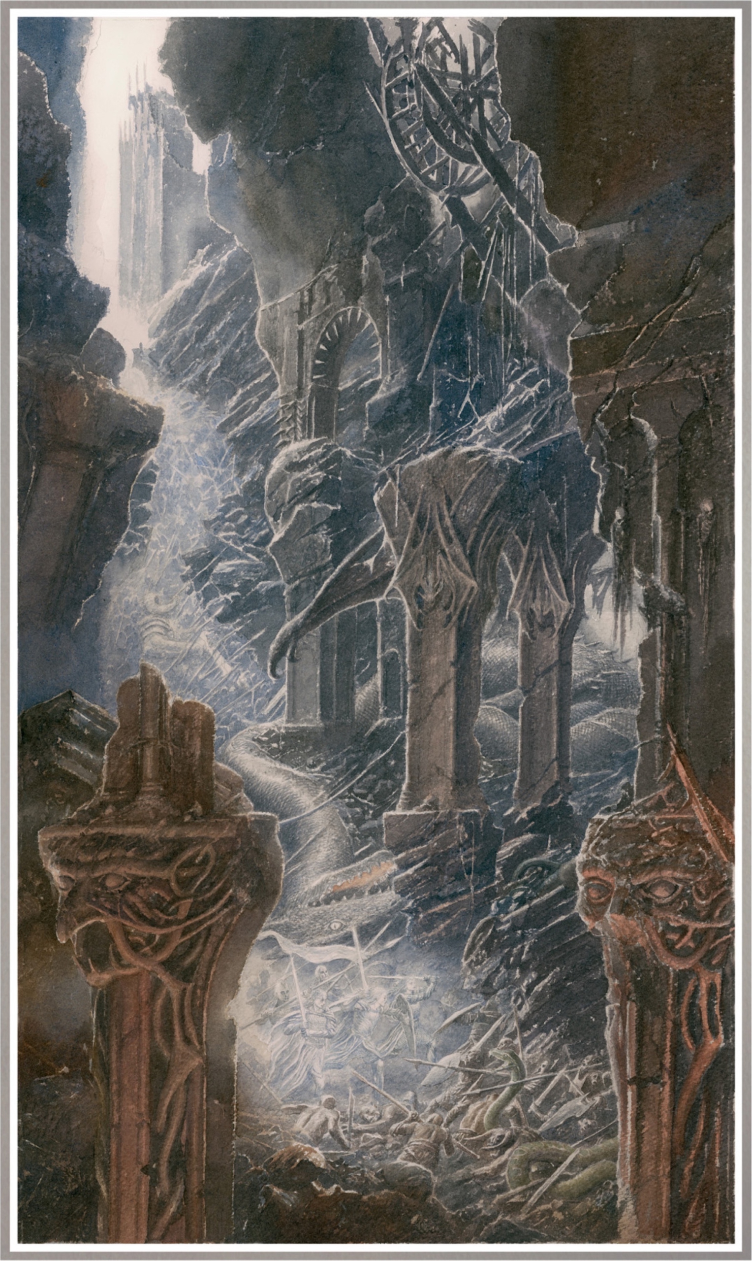 "И он сошел на Арду в силе и величии, большей, чем у любого другого из Валар, как гора, которая бродит в море и имеет свою голову над облаками и одета во льды и увенчана дымом и огнем; и свет глаз Мелькора был подобен пламени, которое иссушает жаром и пронзает смертельным холодом."