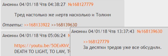 >>616733 В комментариях к первой части этот самый Косяков пишет: >Что касается интернационализма, то очевидно же, что у Толкина это интернационализм в пределах расизма. Толкин призывает к объединению всех белых для уничтожения и порабощения всех не-белых.