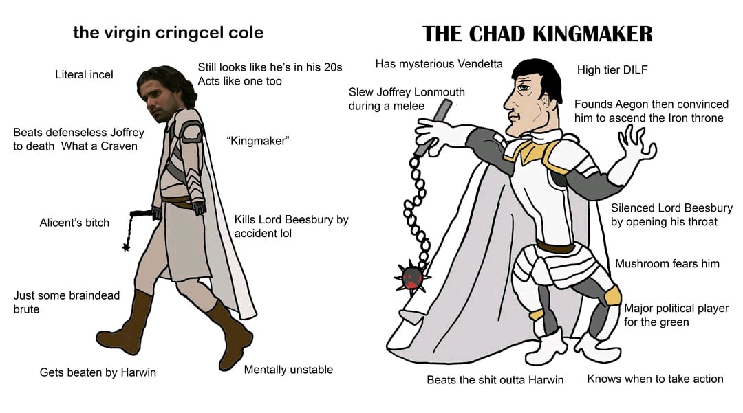>>613067 >и блядство у другой Да Серсею в основном не за это хейтили лол. Ее хейтели за то что она до карикатурности жестокая, да еще и тупая при этом. Диды это убрали, сделали ее Тайвином в юбке(которым и мечтала быть книжная Серсея) >Наверно днем с огнем надо искать кадра, которому дидовский мерисьюшный паладин нравится больше Один годами обитал в тронотреде, Жомофаг зовут. >чем мартиновский завистливый Ну у него и зависть весьма благородно выглядит, надо заметить. В том смысле что он ей никогда не поддавался и зла семье желал, не то что действия подобные предпринимал. Но так то конечно ему хочется быть на месте Робба, первородным законорожденным сыном, отсюда нытье, а от нытья все эти сны, в которых он Роббу голову отрубает. То есть он даже за мысли, что ему хочется быть Роббом, осуждает себя. >клятвопреступник Всё правильно сделал. Тут дилемма как у Джейме. Не осуждаю ни того, ни другого.