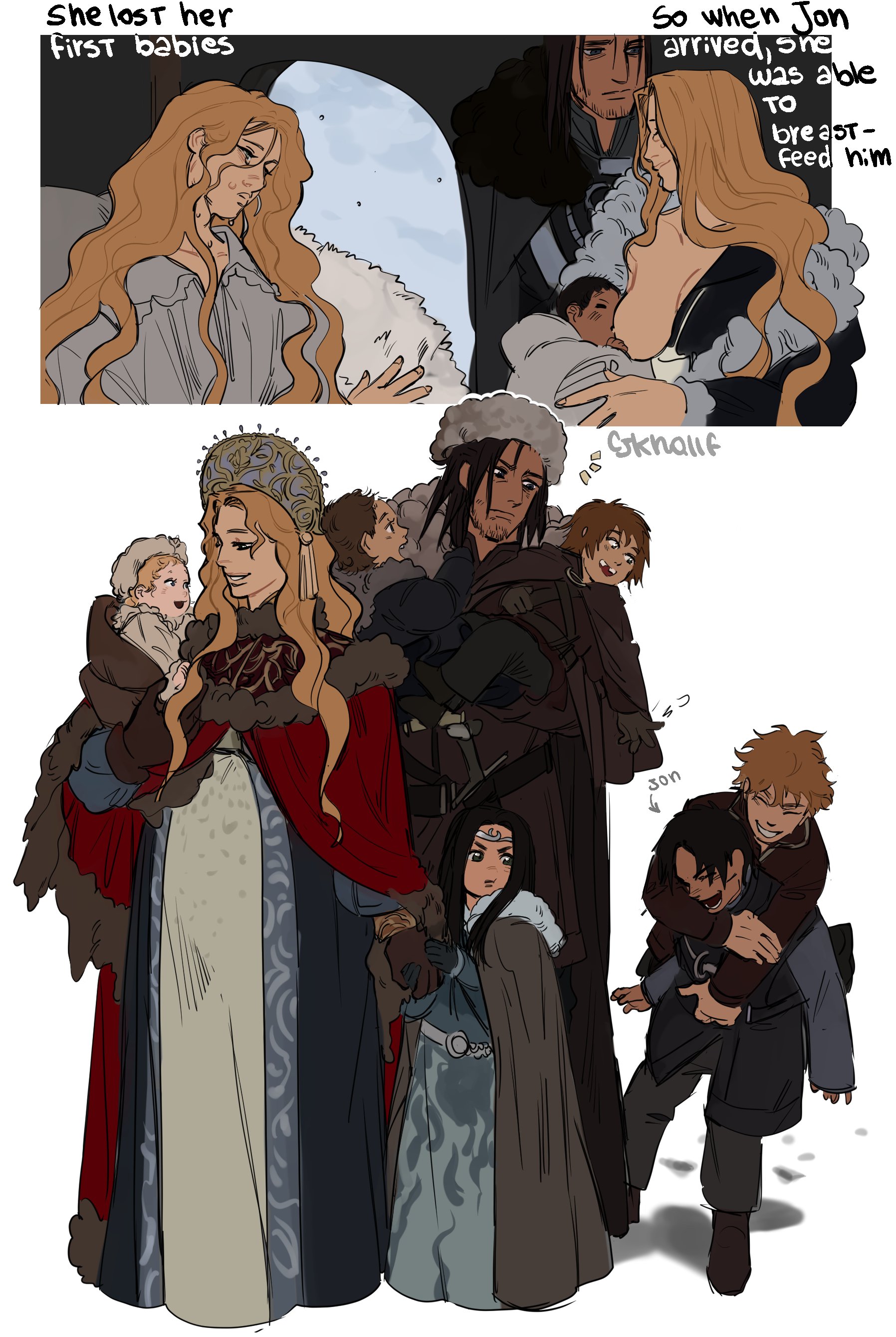 Почему у Вал и у Жона не один цвет кожи, лол ? Мне нравится рисовка, но это какая-то совсем дичь, не говоря о том, что человек с таким тоном кожи при многолетней зиме выжить не сможет. От дефецита витамина Д умрёт.