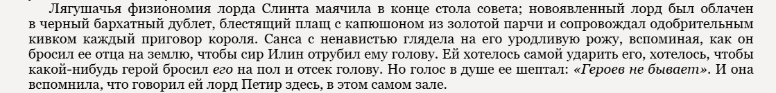 >>614023 >Просто у тебя вкуса нет. Кстати, можешь попытаться предложить перевод лучше. Ну, а смысл в художке переводить ? Ты просто заново книгу переписываешь по-сути, то есть события те же, но язык то совершенно другой. Надо быть просто хорошим писателем, чтобы хорошо перевести, но нахуя хорошему писателю тратить силы на переводы чужих работ, когда он может написать свою ? Переводить имеет смысл что-нибудь с ужасной прозой на самом деле. >Ты написал что это должно было иметь глобальные последствия. Ну да. >Цитату пожалуйста. Я же не поленился и нашёл. На одном из Малых Советов была тема того, что надо сразу давить топику того, что после долгого лета должна быть долгая зима как паникёрская. >С чего вдруг? Просто магия там это магия. Ну, потому что если следовать её не написанным законом пропадает интрига того, что сработает, а что нет. Магия в повествовании подаётся как нечто очень ненадёжное. Ты если не заметил, то главное к чему выстраивается повествование в книгах-это сюрпризы, удивить читателя в моменте для Мартина важнее всего. Всё таки человек ТВ формат Голливуда в себя впитал.