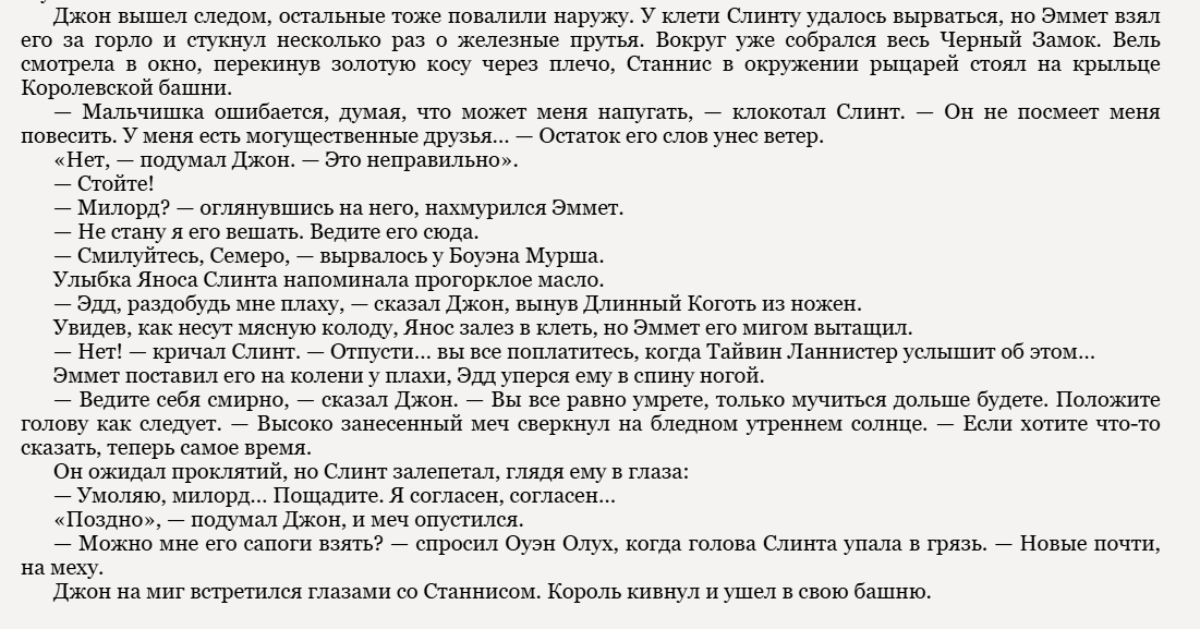 >>614411 >Просто признайте, что без разговоров о Станнисе Слабый байт. Давай еще пробуй. >главы Бриенны. Ну сука до чего же увлекательное, душевное, пронзительное чтиво. Главы Арьи и "Данк и Эгг" не идут ни в какое сравнение А вот это уже нормально так забайтил. Ничего не имею ни против Пира, ни против глав Бриенны в частности, но главы Арьи и Дунк и Эгг - это швитое. Особенно хороши главы Арьи в БК два последних рассказа о Дунке.