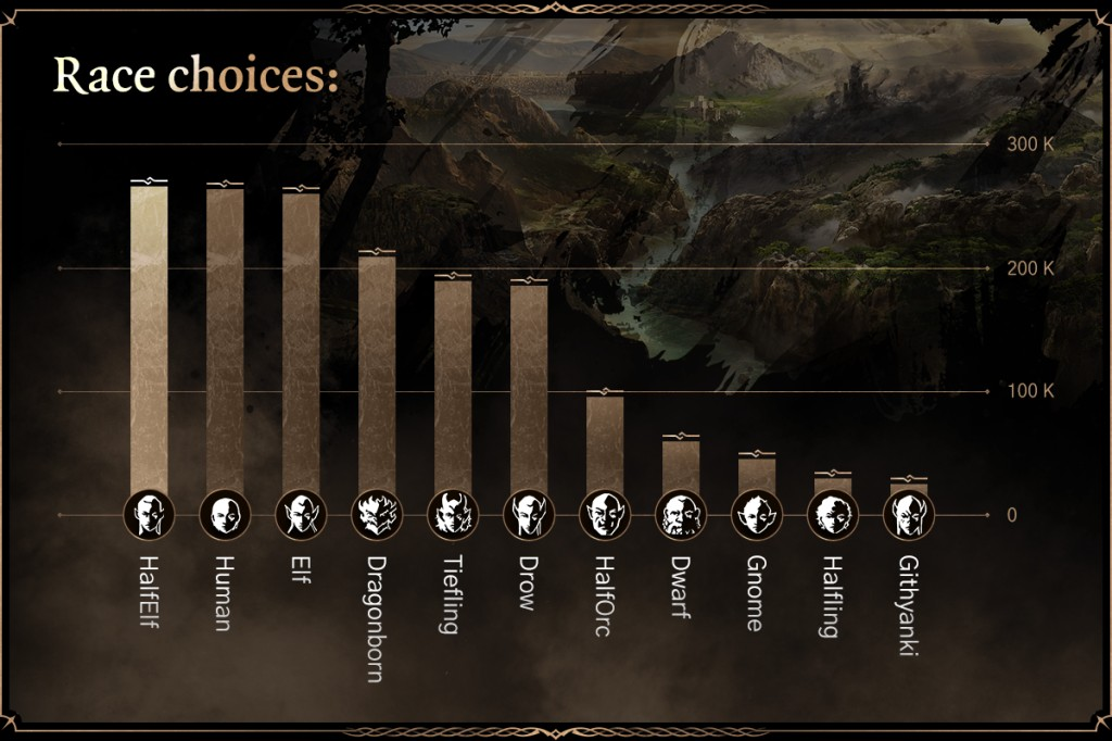 >>623938 Я вообще не понял, нахера анон притащил статистику ИГРОВЫХ персонажей. Речь ведь шла про то, что темные эльфийки - популярны для романтических фантазий, а не то что за них играть хотят.